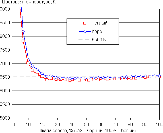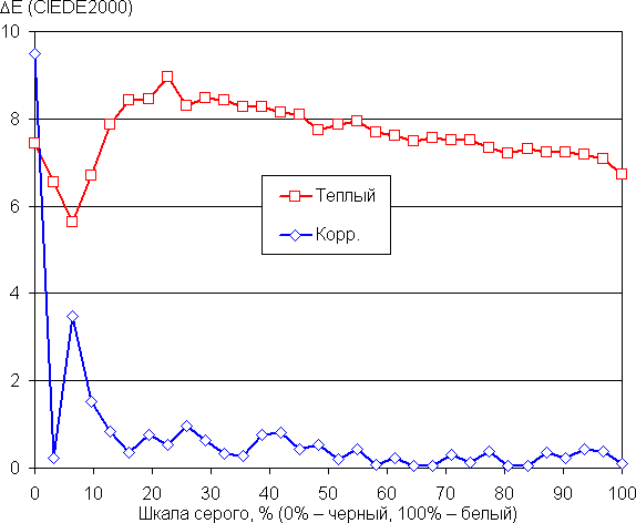 Цветовой баланс просто при выборе предустановленного профиля Теплый немного отличается от стандартного (но при этом достигаются максимальные значения яркости и контрастности), поэтому мы попытались вручную скорректировать цвета, регулируя усиление трех основных цветов. Графики ниже показывают цветовую температуру на различных участках шкалы серого и отклонение от спектра абсолютно черного тела (параметр ΔE) в случае исходного профиля Теплый и после ручной коррекции (50, 46 и 49 для интенсивностей красного, зеленого и синего цветов, настройку Контрастность уменьшили до 45 чтобы избежать резкого изменения ΔE на белом):
