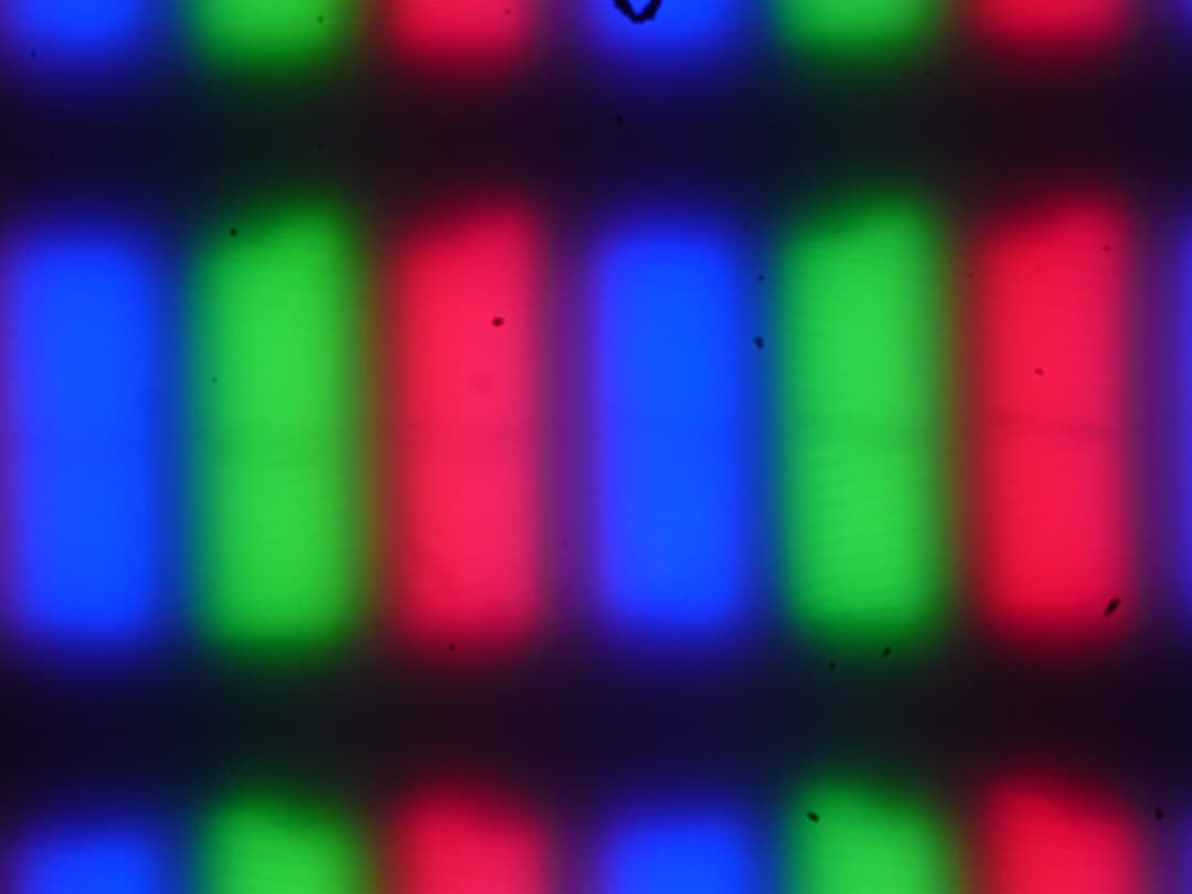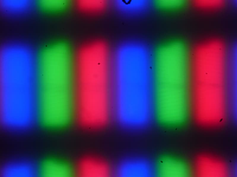 Из-за матовой поверхности экрана четкого изображения пикселей получить не удалось (черные точки — это пыль на матрице фотоаппарата), однако характерная для IPS структура субпикселей просматривается: