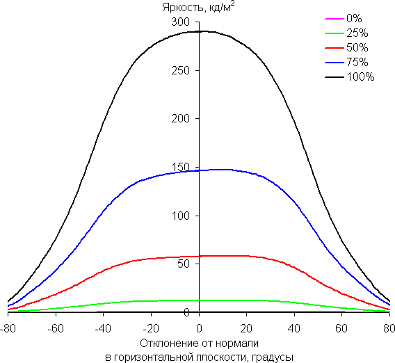 В качестве реперной точки можно выбрать отклонение в 45°, что может быть актуальным в случае, например, если изображение на экране рассматривают два человека одновременно. Критерием сохранения правильности цветов можно считать значение ΔE меньше 3. Стабильность цветов очень хорошая, это является одним из главных достоинств матрицы типа IPS.