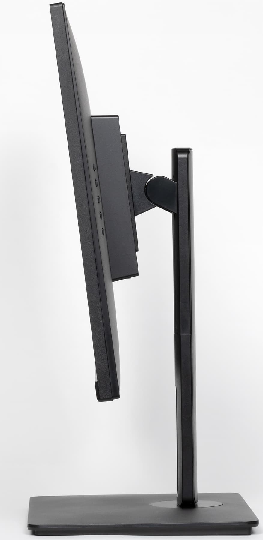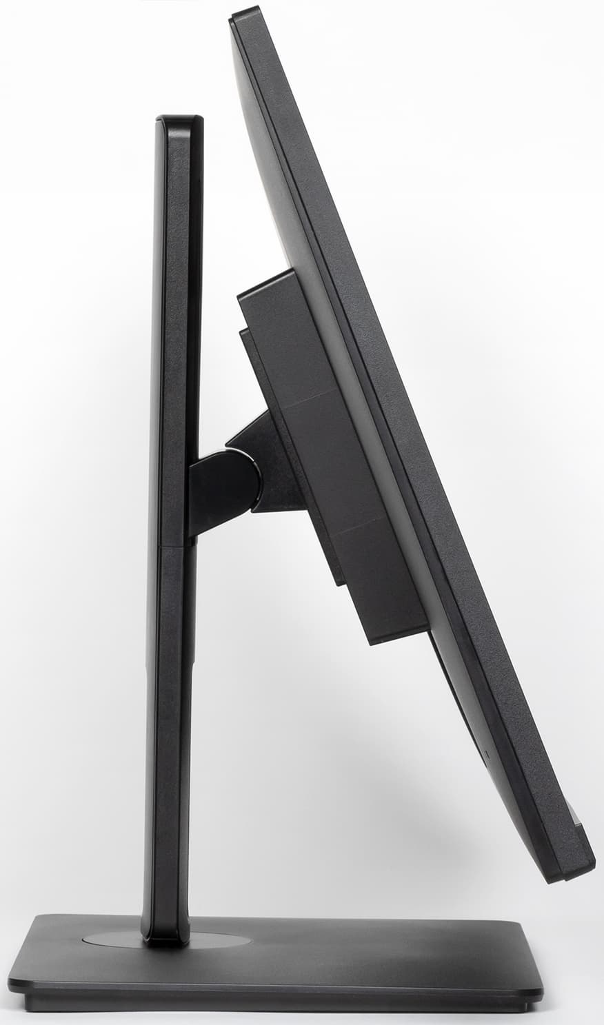 Стойка имеет фиксированную высоту, при этом подпираемый пружиной механизм со стальными направляющими и пластиковыми элементами скольжения обеспечивает вертикальное перемещение узла, на который крепится блок экрана. Штатная подставка позволяет немного наклонить блок экрана вперед, отклонить назад, приподнять-опустить, повернуть вправо-влево и перевернуть в портретную ориентацию по и против часовой стрелки.