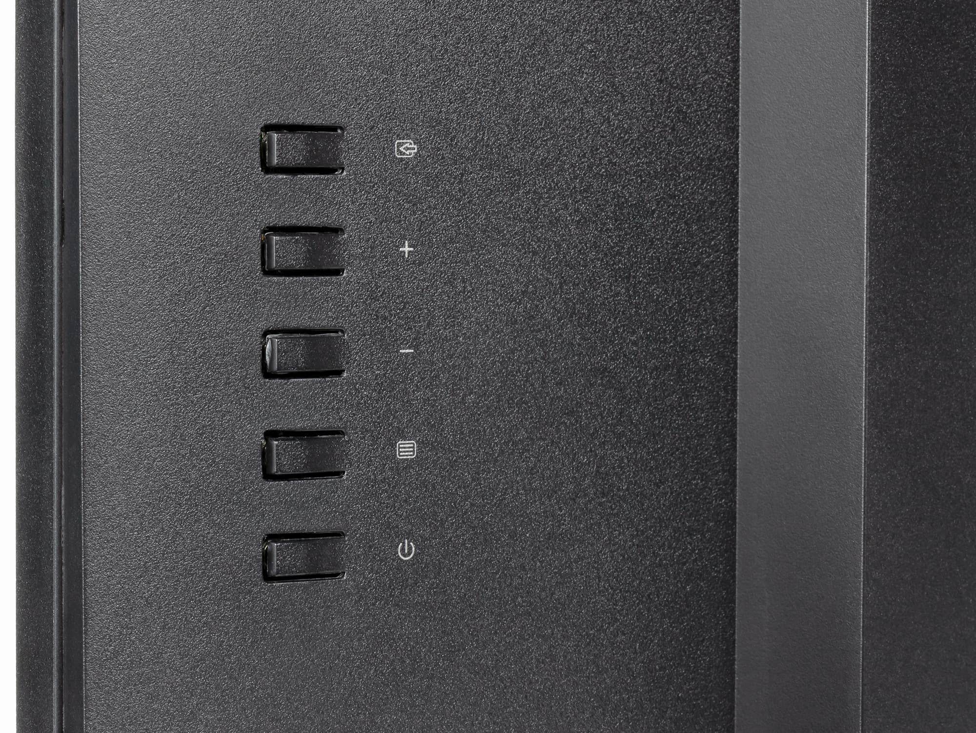 Никаких обозначений и меток, видимых пользователю при работе за монитором, нет, кнопки приходится находить и различать на ощупь, второе непросто, так как кнопки одинаковые и расположены с равным интервалом.