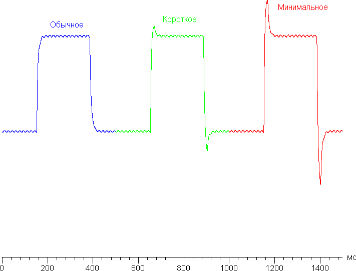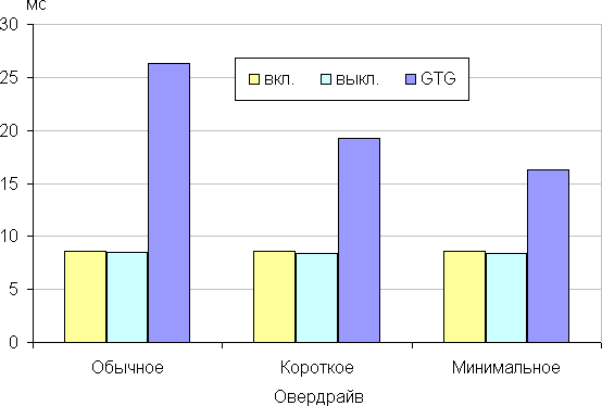 Ступени регулировки три. Диаграмма ниже показывает, как меняется время включения и выключения при переходе черный-белый-черный (столбики «вкл.» и «выкл.»), а также среднее суммарное время для переходов между полутонами (столбики GTG):
