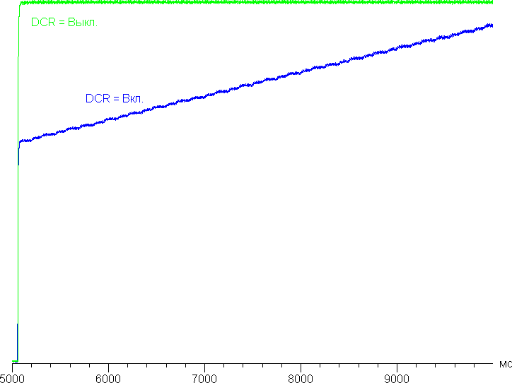 При включении режима DCR установившаяся контрастность формально возрастает до бесконечности, так как на черном поле во весь экран яркость подсветки медленно снижается, и через 16 секунд она выключается совсем. В принципе, динамическая подстройка яркости может улучшить восприятие темных сцен, но в данном случае скорость изменения яркости подсветки невысокая, поэтому практической пользы от этой функции немного. График ниже показывает, как увеличивается яркость (вертикальная ось) при переключении с черного поля во весь экран (после 5 секунд выдержки) на белое поле во весь экран при выключенной и включенной динамической подстройки яркости:
