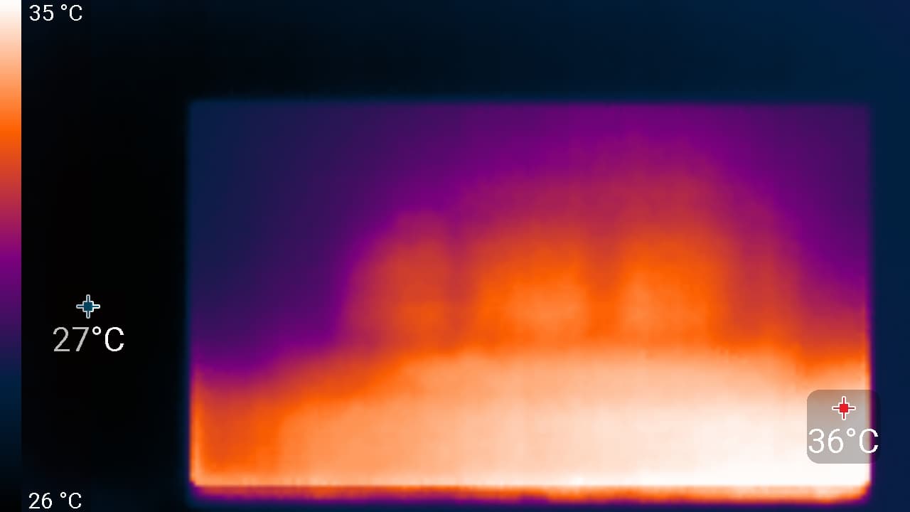 Нижний край экрана нагрелся до 36 °C максимум. Видимо, внизу находится светодиодная линейка подсветки экрана. Нагрев сзади умеренный.