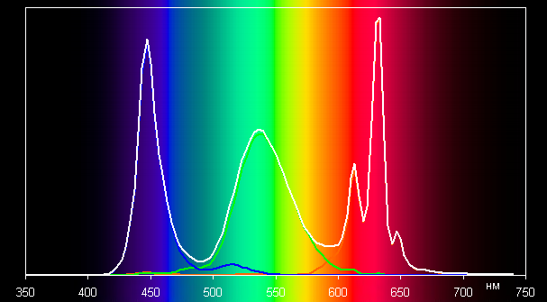 Ниже приведен спектр для белого поля (белая линия), наложенный на спектры красного, зеленого и синего полей (линии соответствующих цветов):