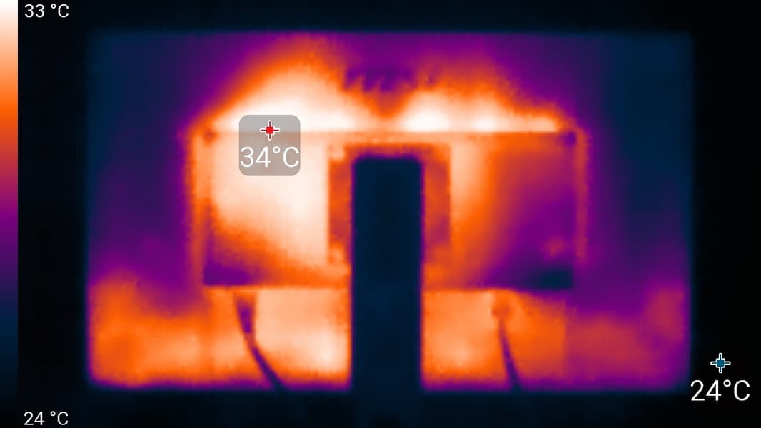 Нагрев монитора можно оценить по приведенным снимкам с ИК-камеры, полученным после долговременной работы монитора на максимальной яркости в помещении с температурой примерно 24 °C: