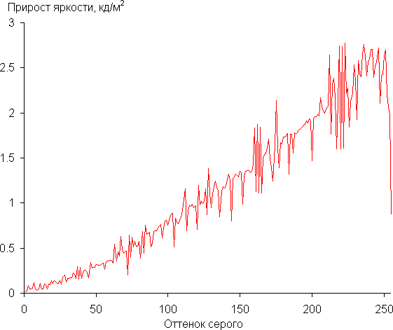 Для оценки характера роста яркости на шкале серого мы измерили яркость 256 оттенков серого (от 0, 0, 0 до 255, 255, 255). График ниже показывает прирост (не абсолютное значение!) яркости между соседними полутонами (настройку Контрастность уменьшили до 48, чтобы исключить завал в светах на один оттенок):