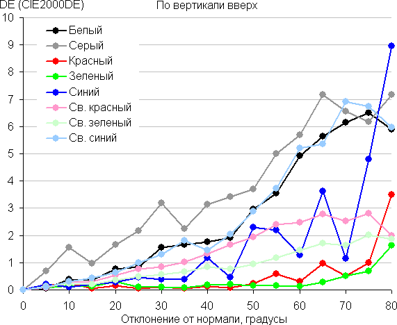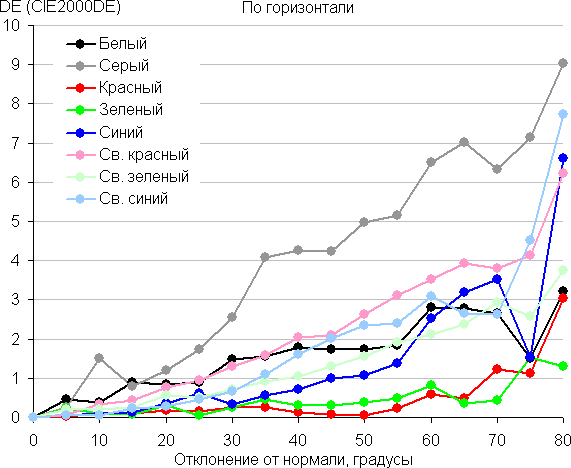 Для количественной характеристики изменения цветопередачи мы провели колориметрические измерения для белого, серого (127, 127, 127), красного, зеленого и синего, а также светло-красного, светло-зеленого и светло-синего полей во весь экран с использованием установки, подобной той, что применялась в предыдущем тесте. Измерения проводились в диапазоне углов от 0° (датчик направлен перпендикулярно к экрану) до 80° с шагом в 5°. Полученные значения интенсивностей были пересчитаны в ΔE относительно замера каждого поля при перпендикулярном положении датчика относительно экрана. Результаты представлены ниже:
