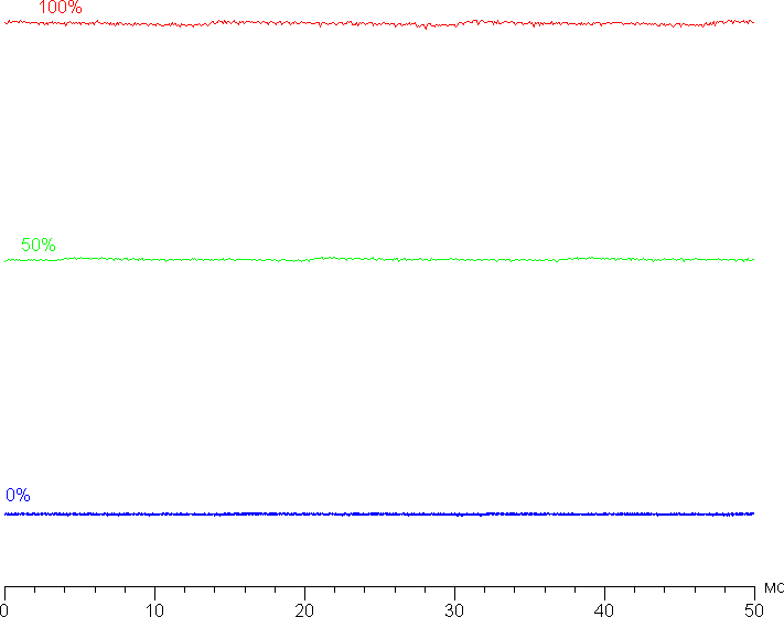 На любом уровне яркости значимая модуляция подсветки отсутствует, что исключает видимое мерцание экрана. В доказательство приведем графики зависимости яркости (вертикальная ось) от времени (горизонтальная ось) при различных значениях настройки яркости:
