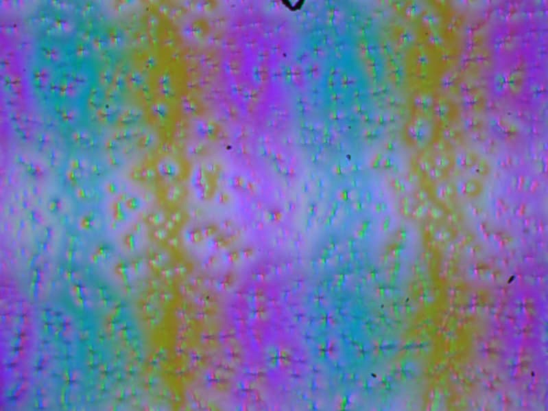 Зерно этих дефектов в несколько раз меньше размеров субпикселей (масштаб этих двух фотографий одинаковый), поэтому фокусировка на микродефектах и «перескок» фокуса по субпикселям при изменении угла зрения выражены слабо, из-за этого нет и «кристаллического» эффекта.
