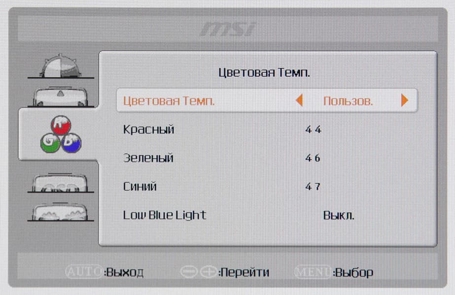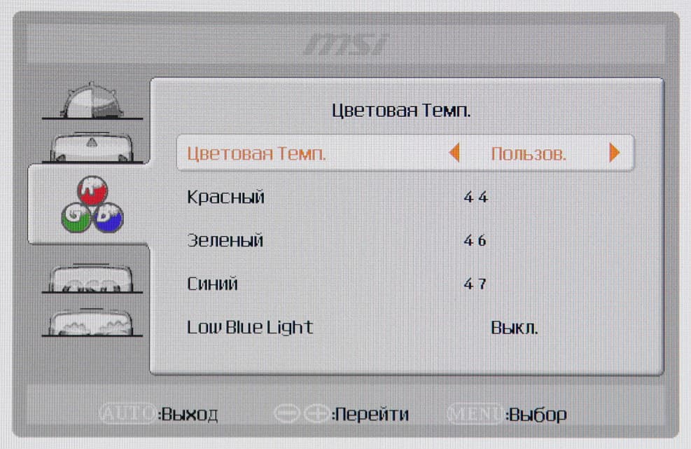 Цветовой баланс устанавливается выбором одного из предустановленных профилей или ручной регулировкой интенсивности трех цветов после выбора профиля Пользов.