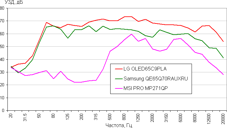 Сравним АЧХ акустики этого монитора с АЧХ двух телевизоров высшего класса (получена с помощью шумомера при воспроизведении звукового файла с розовым шумом, интервал УЗД в 1/3 октавах):