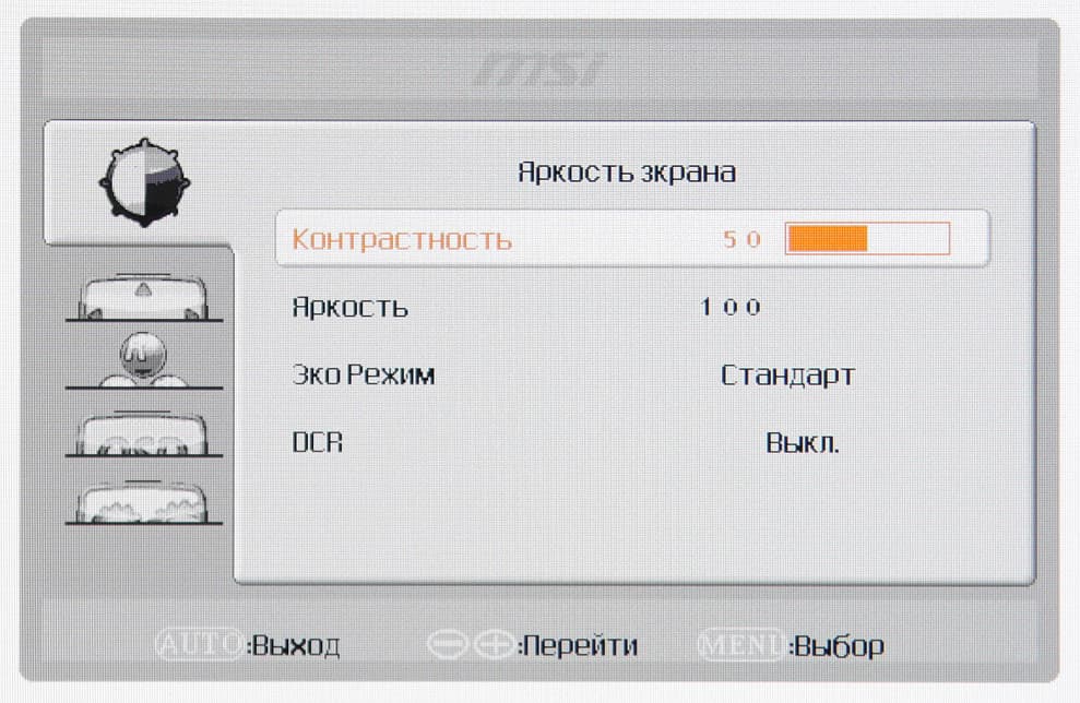 Настроек изображения совсем немного. Присутствуют стандартные настройки Контрастность и Яркость (регулирует яркость подсветки). Профили в списке Эко Режим — это предустановленные значения яркости. Есть и режим с динамической регулировкой яркости подсветки.