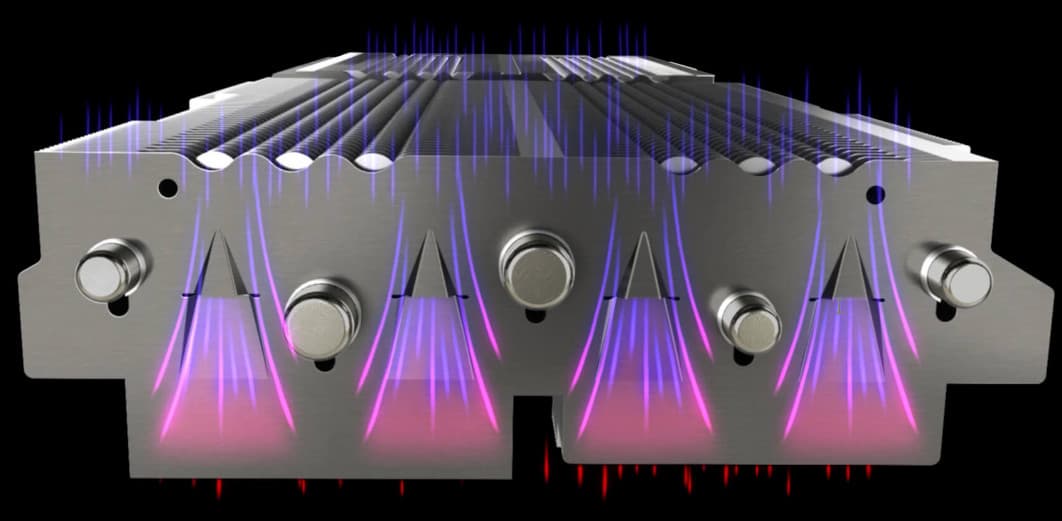 Поверх радиатора установлен кожух с тремя вентиляторами ∅95 мм типа Torx 4.0, имеющими особый дизайн лопастей (соединенных попарно) для усиления потока воздуха, направленного на радиатор.