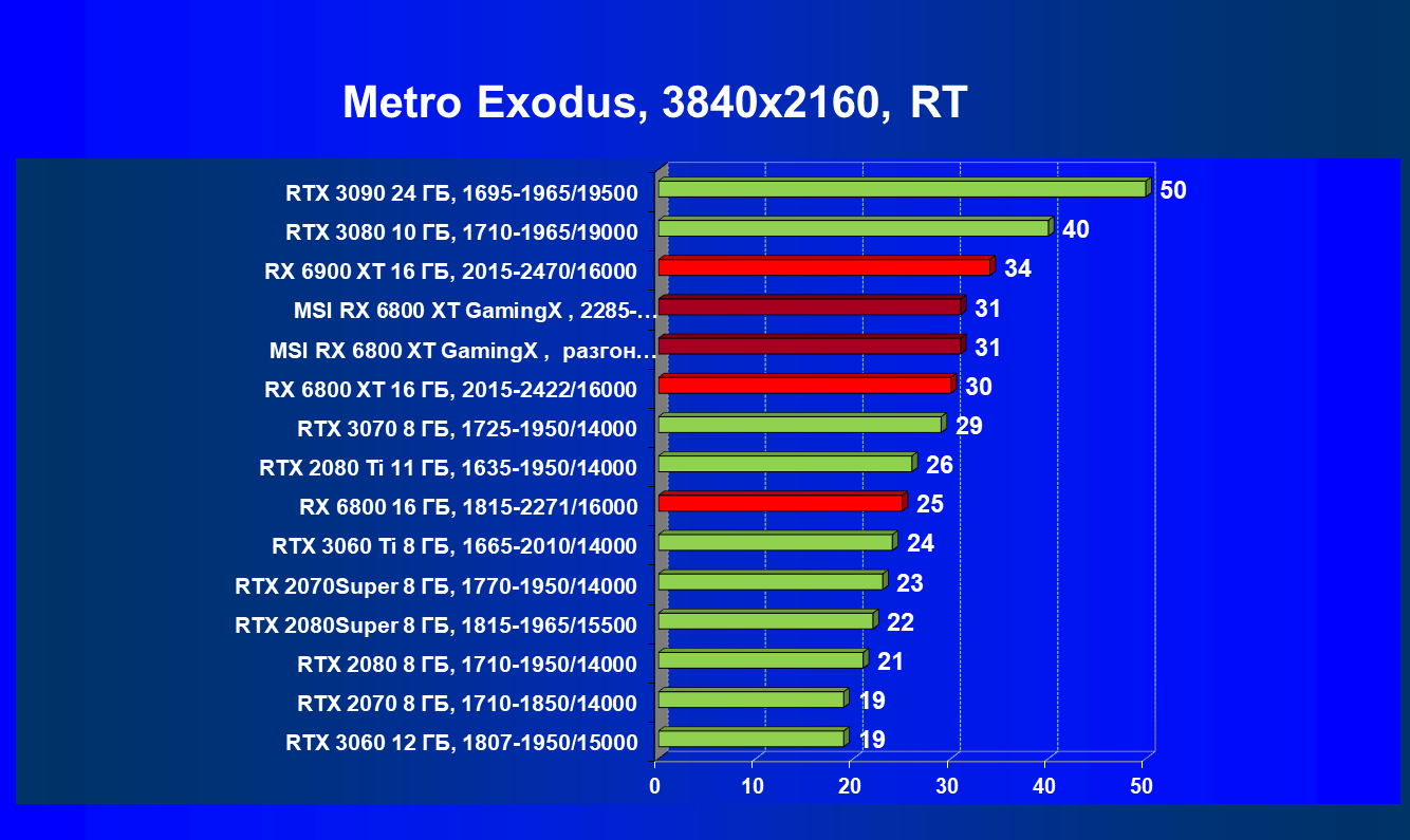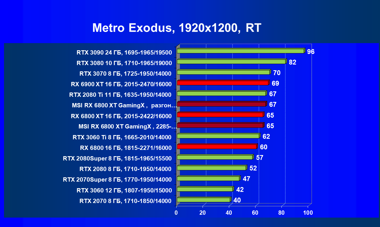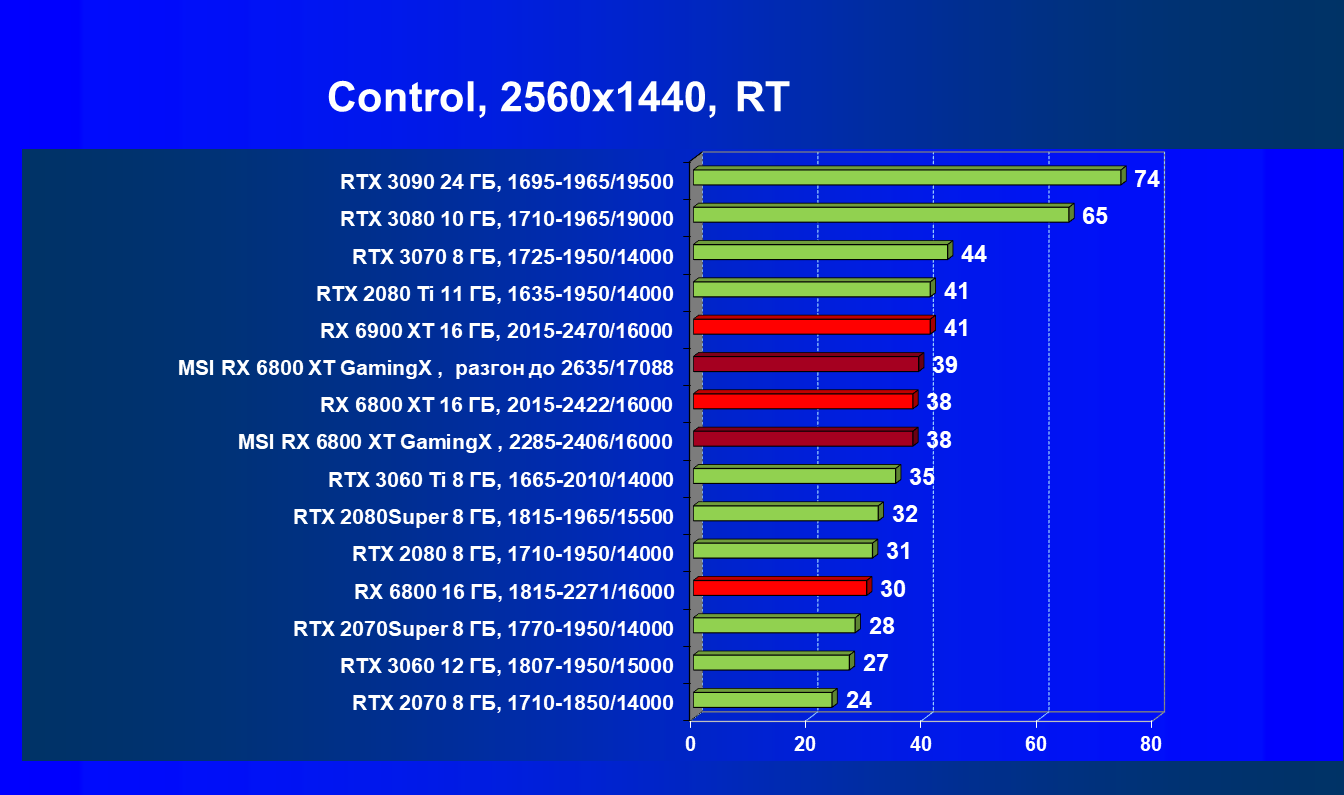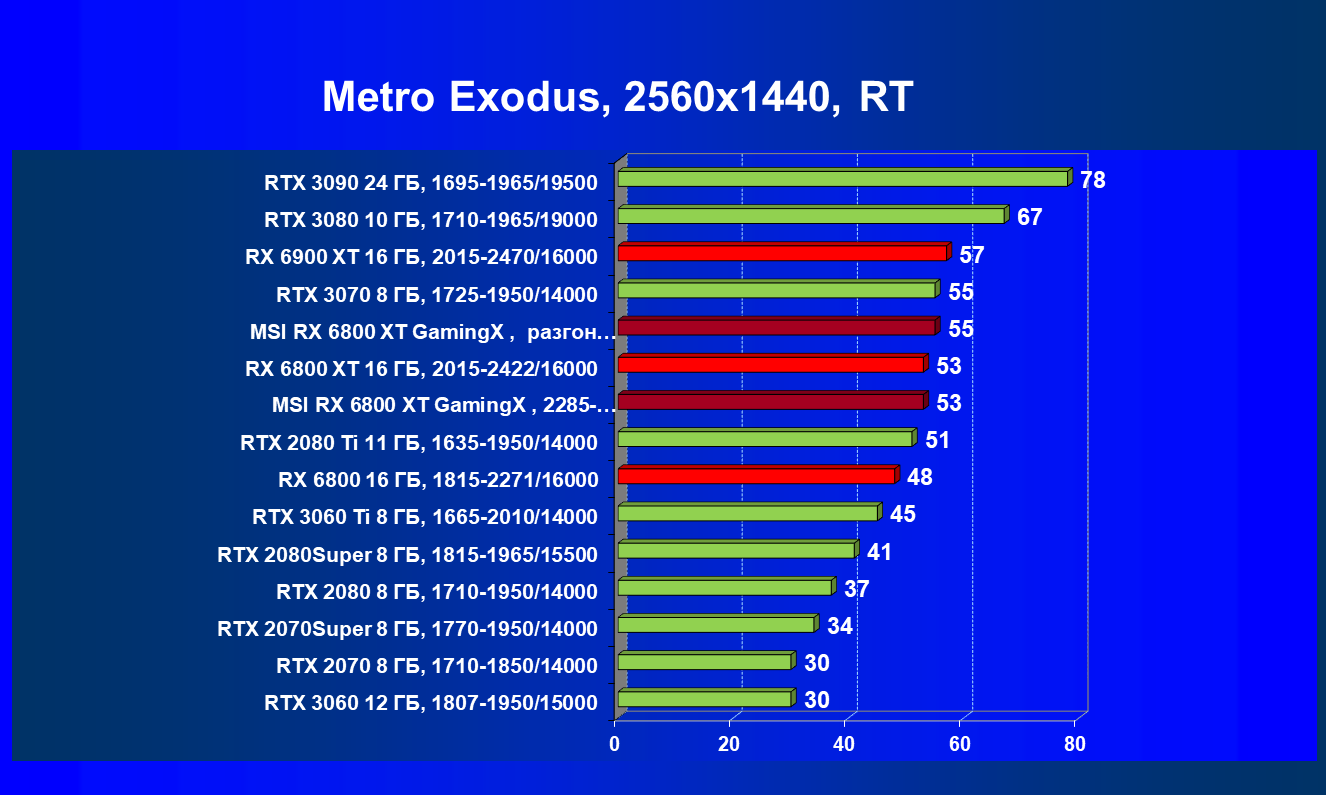 Nvidia GeForce RTX 3080 и AMD Radeon RX 6800 XT являются прямыми соперниками, они демонстрируют почти равную производительность, позволяющую комфортно играть в 4К при максимальных настройках графики, но только в игры без использования трассировки лучей (RT) — при включении трассировки лучей производительность Radeon 6800 XT может упасть до уровня GeForce RTX 3060 Ti. Видеокарта MSI чуть производительнее, чем референсный аналог.
