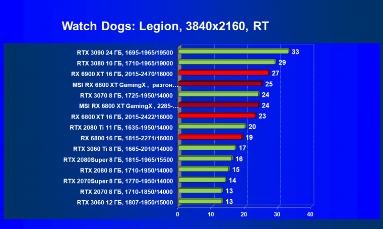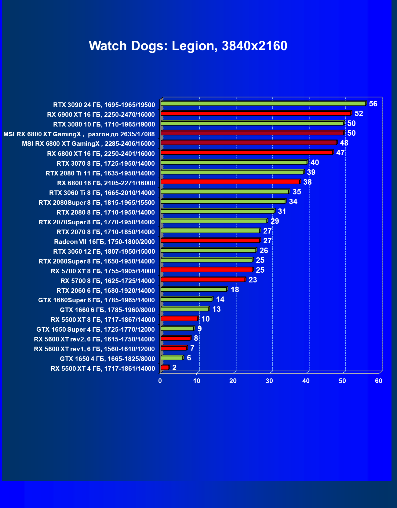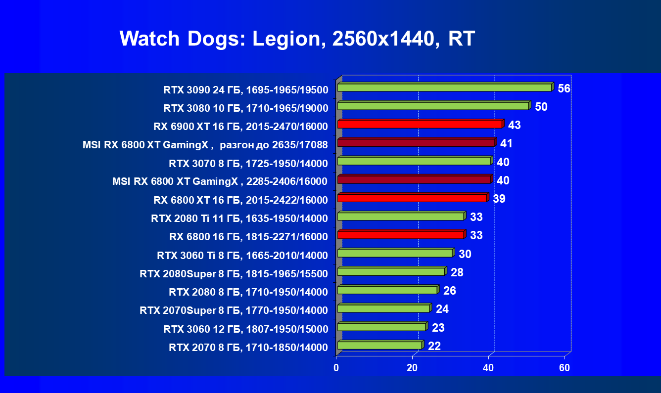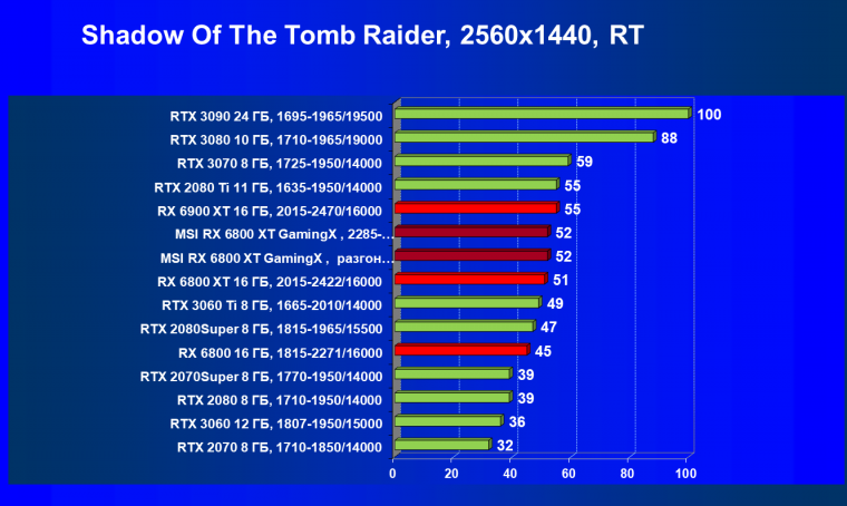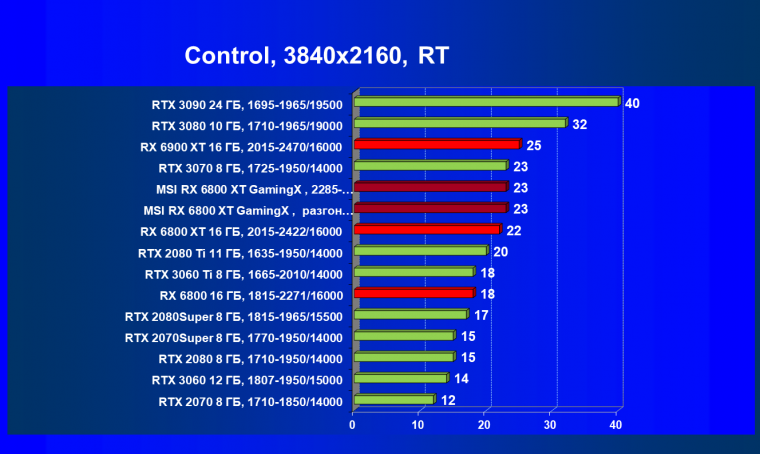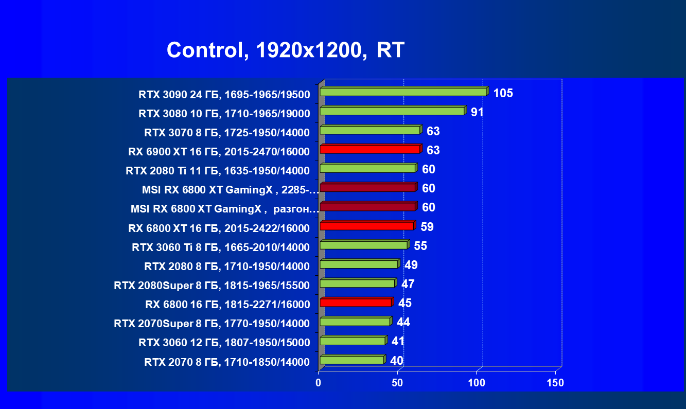 Nvidia GeForce RTX 3080 и AMD Radeon RX 6800 XT являются прямыми соперниками, они демонстрируют почти равную производительность, позволяющую комфортно играть в 4К при максимальных настройках графики, но только в игры без использования трассировки лучей (RT) — при включении трассировки лучей производительность Radeon 6800 XT может упасть до уровня GeForce RTX 3060 Ti. Видеокарта MSI чуть производительнее, чем референсный аналог.