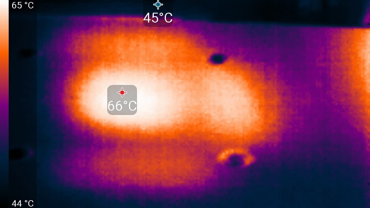 После 2-часового прогона под нагрузкой максимальная температура ядра не превысила 78 °C, что, наверное, является приемлемым результатом для видеокарт такого уровня. Максимальная мощность была зафиксирована на уровне 266 Вт, а максимальный нагрев наблюдался в центре PCB, и основными источниками нагрева являются графический процессор и преобразователи силовой цепи.