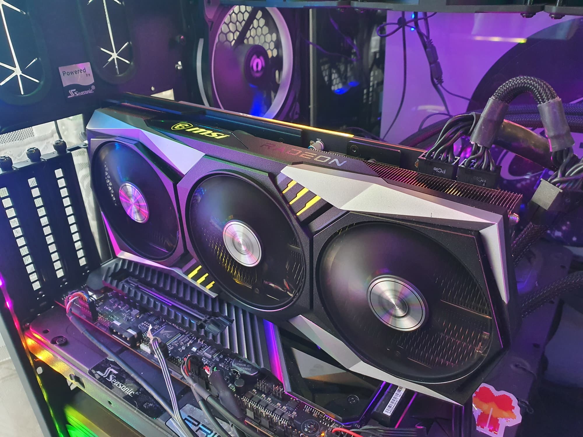 MSI Radeon RX 6800 XT Gaming X Trio 16G (16 ГБ) — прекрасный конкурент флагманским видеокартам на Nvidia GeForce RTX 3080 для игр без трассировки лучей: в целом они почти на одном уровне. Если вынести за скобки GeForce RTX 3090, как изначально полуигровой-полупрофессиональный продукт, то Radeon RX 6800 XT и GeForce RTX 3080 — самые передовые игровые ускорители. Карта MSI имеет приличные размеры из-за кулера, она занимает 3 слота в системном блоке, но зато СО тихая.