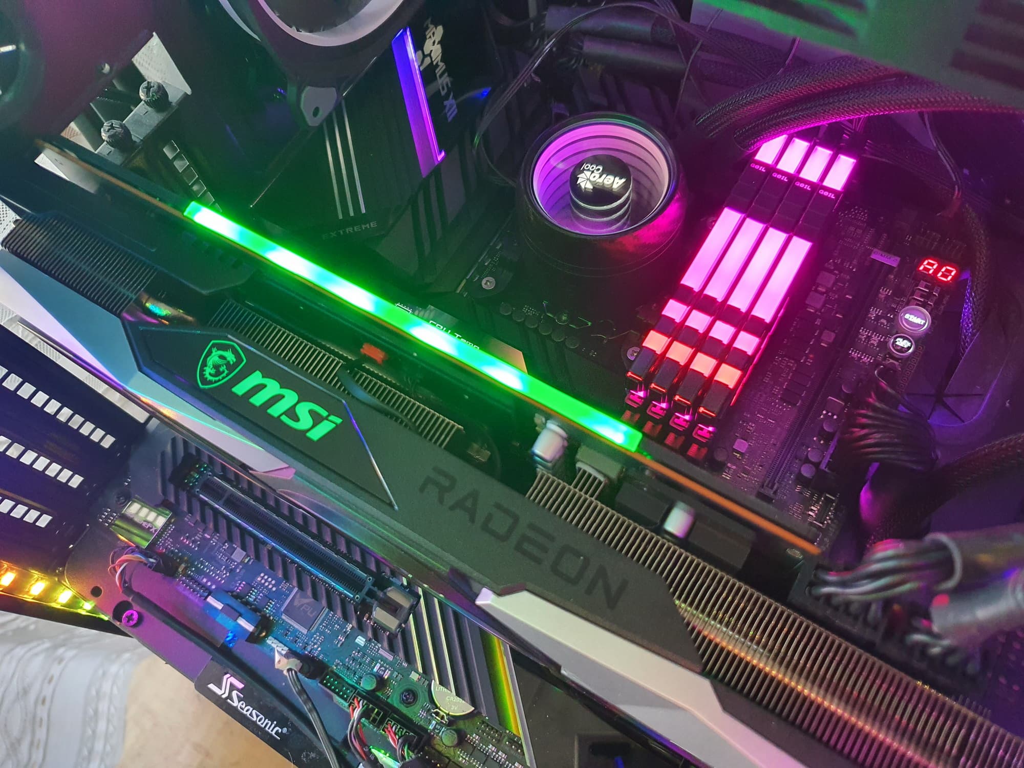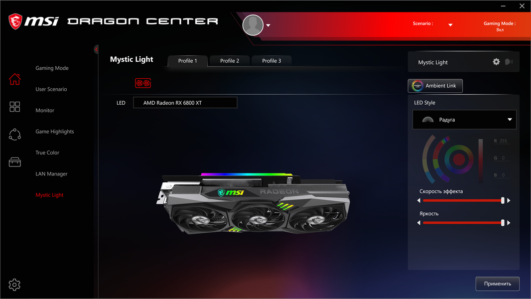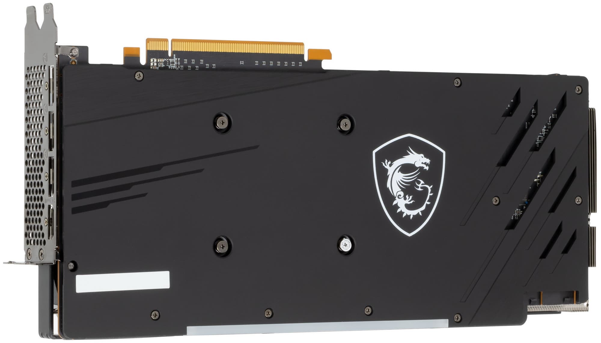 Карта MSI имеет стандартный набор видеовыходов (3 DP + 1 HDMI), питание подается через пару 8-контактных разъемов. Нельзя не отметить красивую подсветку. Стоит отдельно упомянуть отличное программное сопровождение MSI — как многофункциональный Dragon Center, так и всемирно известную утилиту Afterburner. Также сейчас в драйверах AMD имеется превосходная панель управления, предлагающая массу настроек ускорителей.