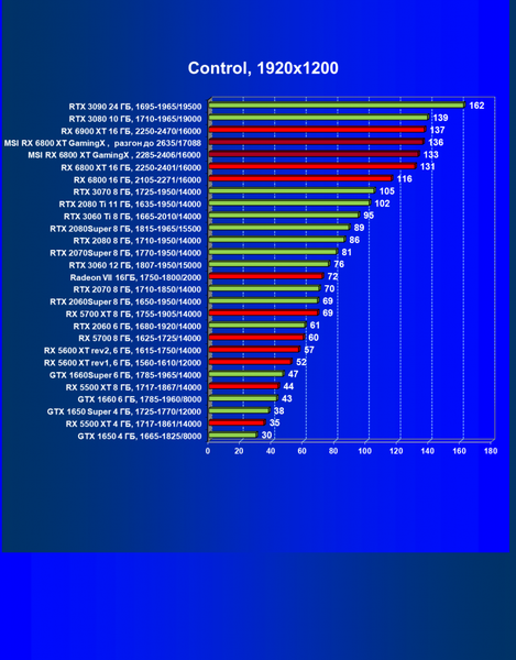 Здесь расклад уже совсем другой: при включении RT производительность Radeon RX 6800 XT падает намного сильнее, чем у GeForce RTX 3080, поэтому референсный Radeon RX 6800 XT оказался на последнем месте в группе. Карта MSI — чуть выше за счет фабричного разгона, однако даже ручной разгон не помог ей дотянуться хотя бы до GeForce RTX 3070. Для игр с RT пока предпочтительнее ускорители Nvidia, в случае карт на GPU AMD придется снижать разрешение и/или настройки качества в таких играх.