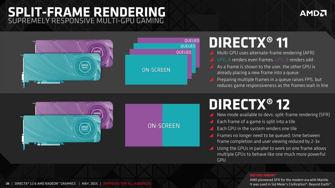 А теперь еще об одном совпадении (из разряда Совпадение? Не думаю!). Информация о потенциальном светлом будущем стала просачиваться в массы с 2015 года. Напомним: и AMD, и Nvidia начали сворачивать классические технологии multi-GPU с 2014-го. Во всяком случае, именно тогда вышли последние двухпроцессорные «бытовые» видеокарты обоих производителей. В дальнейшем они несколько лет не мешали пользователям собирать такие конфигурации самостоятельно, но теперь уже и способствовать этому перестали. Зато дружно начали заниматься развитием технологий, со SLI и CrossFire просто несовместимых. Логика простая: зачем пытаться развивать явно тупиковое решение «на уровне драйвера», когда предложено более гибкое и универсальное? И, главное, основную часть работы по реализации которого можно переложить со своих программистов на ту же игровую индустрию. Поскольку если игра умеет использовать multi-GPU средствами API — это ей дополнительный плюс, а если что-то идет не так — в худшем случае минус, но минус игре же. И ее разработчикам. А все шишки за огрехи SLI и CrossFire, естественно, доставались AMD и Nvidia — даже если возникали не по их вине.