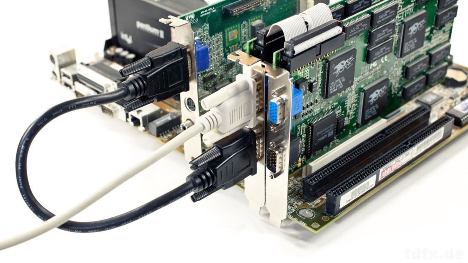 Однако цена последних постоянно снижалась, так что к 1996 году 3dfx смогла выйти и на ПК-рынок. Как таковых видеокарт компания делать не умела, поэтому и пытаться не стала. Ее первая разработка — Voodoo Graphics — представляла собой дополнительную карту расширения, использующуюся только в 3D-режимах. Для «классики» требовалась обычная видеокарта, а для решения проблем совместимости использовалось сквозное подключение, т. е. Voodoo включался между основным видеоадаптером и монитором. «Благодаря» использованию аналогового видеосигнала это зачастую портило картинку в рабочих режимах, откуда и взялась рекомендация переключать кабели только для игры, бо́льшую часть времени оставляя монитор подключенным к основной «видяшке». Цена решения с несколькими картами оказывалась высокой — при том, что и сам Voodoo стоил далеко не сотню долларов (подешевевший еще не значит дешевый). И всё, что он приносил пользователю — аппаратное 3D-ускорение в низких разрешениях (не более 800×600). Но готовые платить и мириться с неудобствами были, причем в массовых количествах, поскольку визуально спутать Quake и GLQuake было просто невозможно. В итоге 1997 год дал нам само понятие 3D-графики, бурный рост этого рынка, массовый выход 3D-игр на ПК, резкий скачок качества картинки (позднее случалось немало скачков, но таких — уже не было ни одного) и т. п.