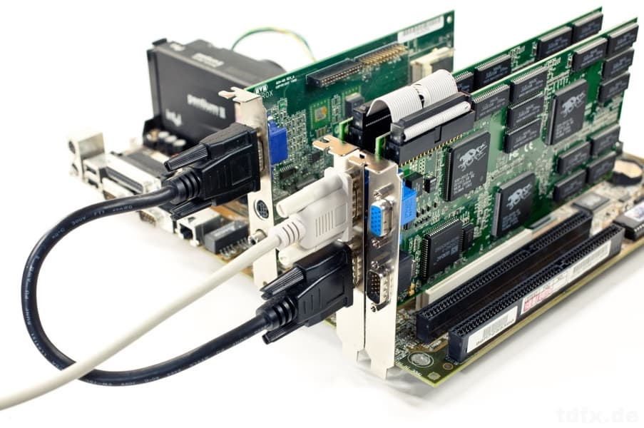 Применительно же к основной теме Voodoo интересен тем, что не только породил весь 3D-рынок, но и оказался первым «несимметричным» многочиповым решением. Сам чипсет мог включать до пяти чипов — один FBI и до четырех TMU. FBI (Frame buffer interface) брал на себя взаимодействие с шиной PCI, дисплеем, кадровым буфером и т. п., выполняя основные 3D-алгоритмы, а блоки TMU (Texture mapping unit) специализировались на работе с 3D-текстурами. Но полная конфигурация была бы слишком дорогой, так что обычным делом была связка из FBI, одного TMU и 4 МБ (это не опечатка!) EDO DRAM. Учитывая же необходимость иметь еще и обычный 2D-ускоритель, получаем три графических чипа в системе. Но и это еще не предел: уже первый Voodoo поддерживал такую технологию, как SLI (Scan Line Interleaving) — метод организации работы двух ускорителей, когда один обрабатывает только четные строки изображения, а второй — нечетные.