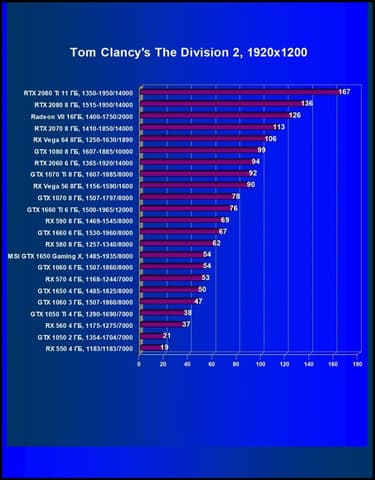 | 17 | MSI GTX 1650 Gaming X, 1485—1935/8000 | 310 | 246 | 12 600 |
