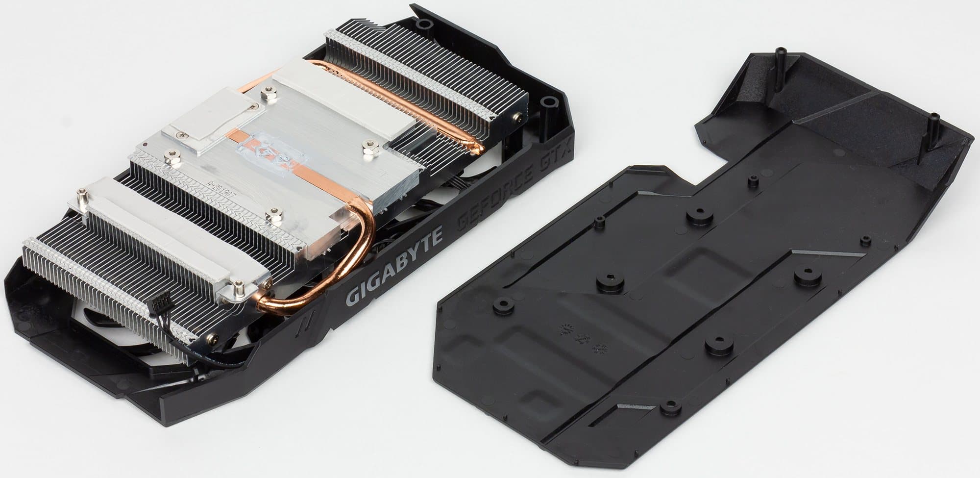 Главной частью системы охлаждения является довольно большой никелированный радиатор, пронизанный двумя тепловыми трубками. Поверх установлен кожух с двумя вентиляторами, работающими на одинаковой частоте вращения. Вентиляторы останавливаются при простое или просто малой нагрузке (при температуре GPU ниже 50-52 градусов). Микросхемы памяти и силовые транзисторы также охлаждаются основным радиатором. С оборотной стороны карта прикрывается декоративной пластиной.