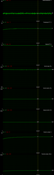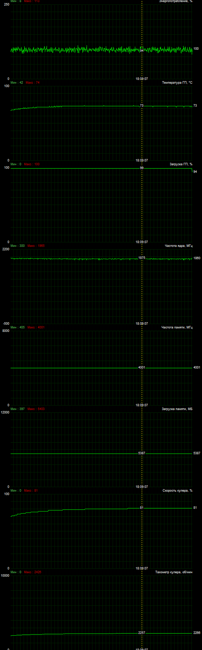 После 6-часового прогона под нагрузкой максимальная температура ядра не превысила 73 градусов, что является удовлетворительным результатом для видеокарты такого уровня.