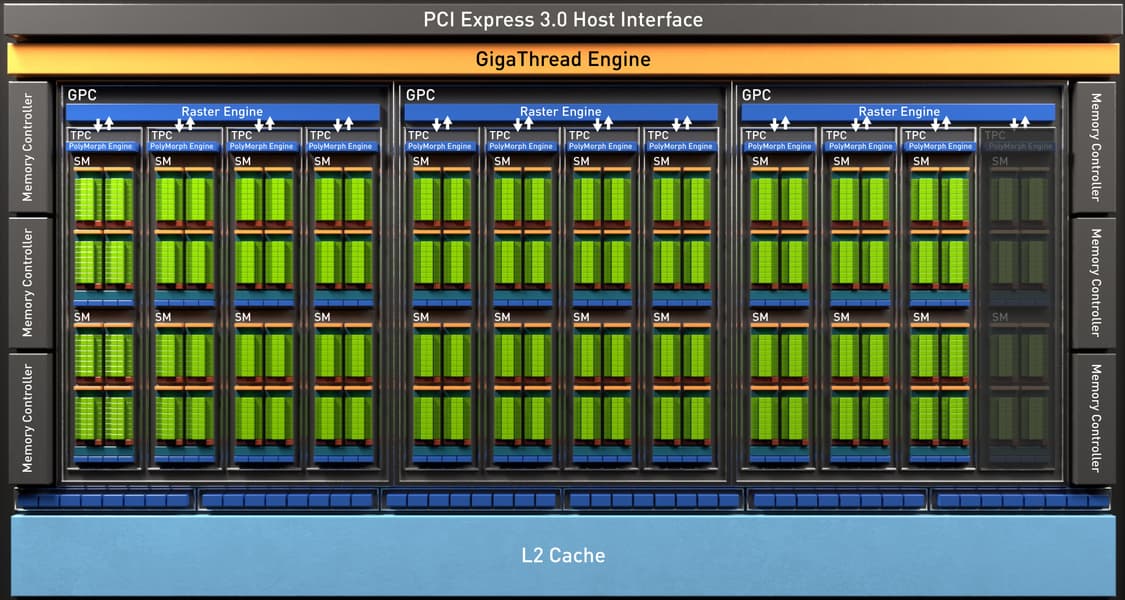 | Вычислительные блоки | 22 (из 24 в чипе) потоковых мультипроцессора, включающих 1408 (из 1536) CUDA-ядер для целочисленных расчетов INT32 и вычислений с плавающей запятой FP16/FP32 |