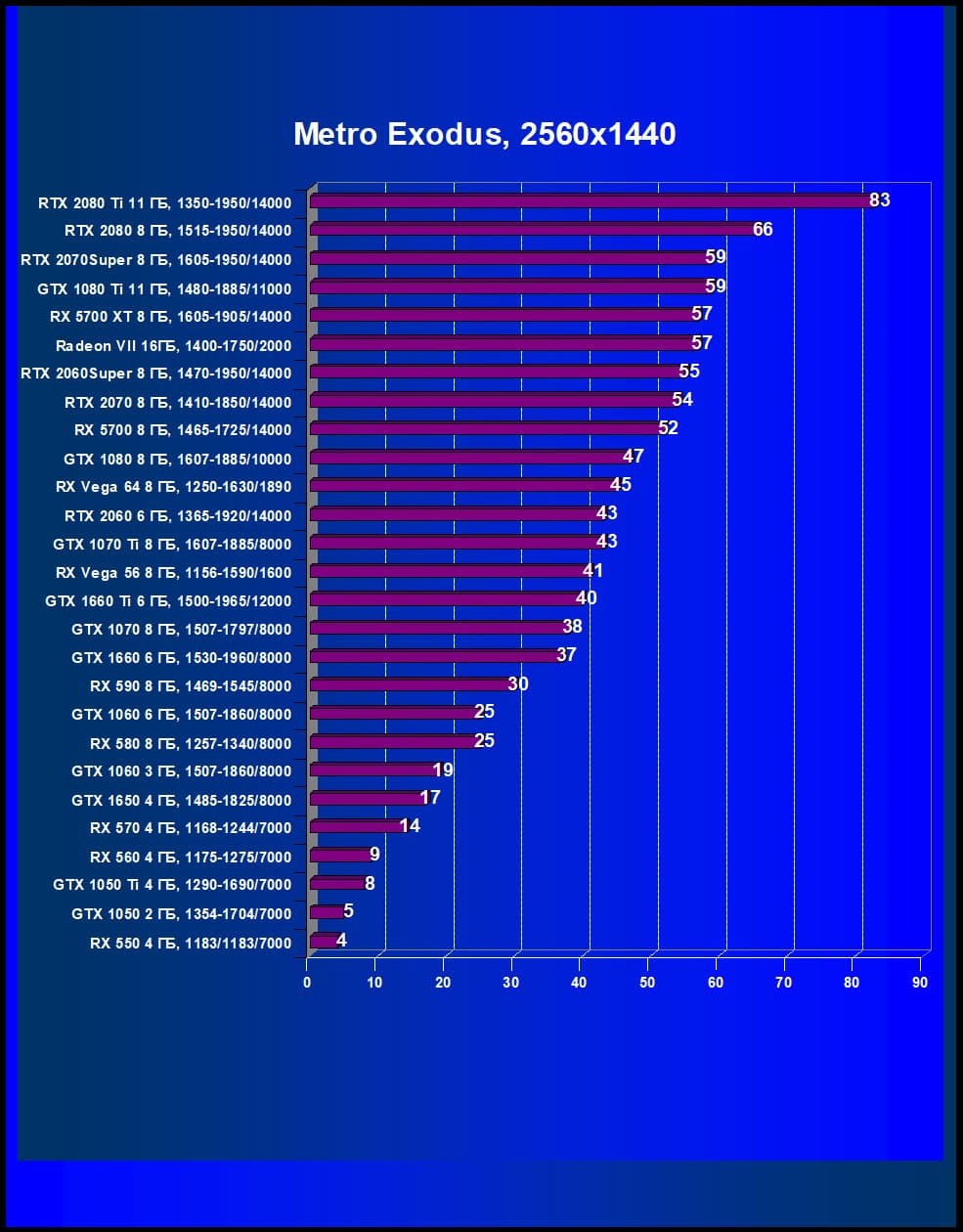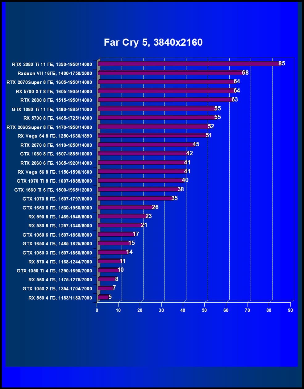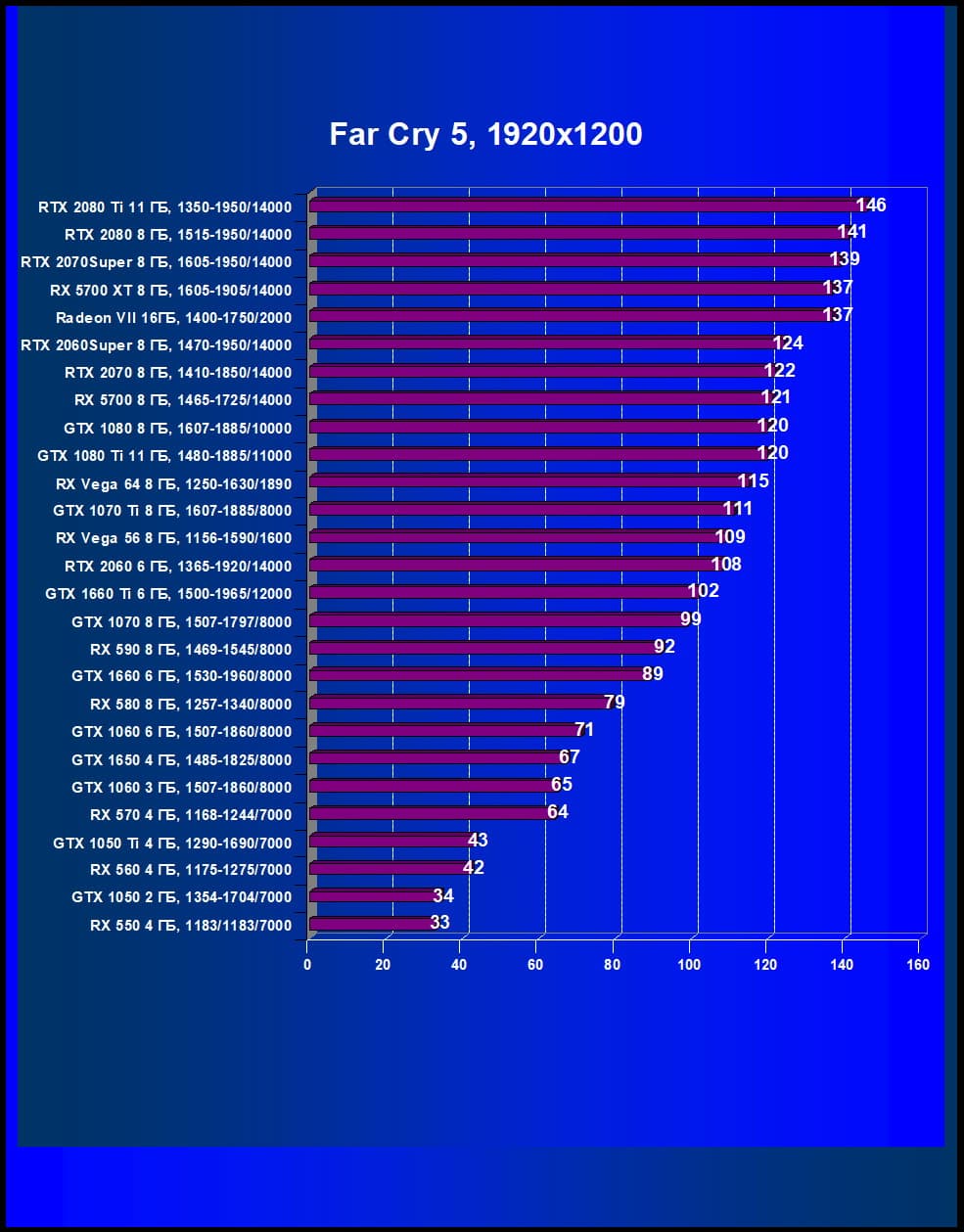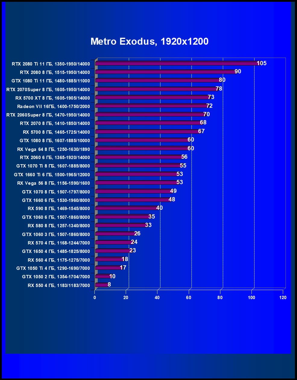 | 05 | RX 5700 XT 8 ГБ, 1605—1905/14000 | 860 | 253 | 34 000 |
