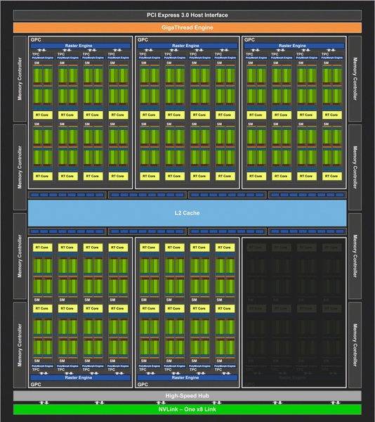 Модель RTX 2060 Super несколько интереснее в том смысле, что она выступает в новом диапазоне — чуть выше простой RTX 2060. Ее предназначение — бороться с Radeon RX 5700 XT и заменить RTX 2070 при сниженной цене. В этой модели используется совсем чуть-чуть урезанный чип TU106, который практически не отстает от аналогичного решения в RTX 2070 — снова благодаря повышенным рабочим частотам GPU. Эта версия TU106 имеет 34 (из 36) активных мультипроцессоров SM, по сути в ней отключен один кластер TPC, вот так это выглядит на схеме: