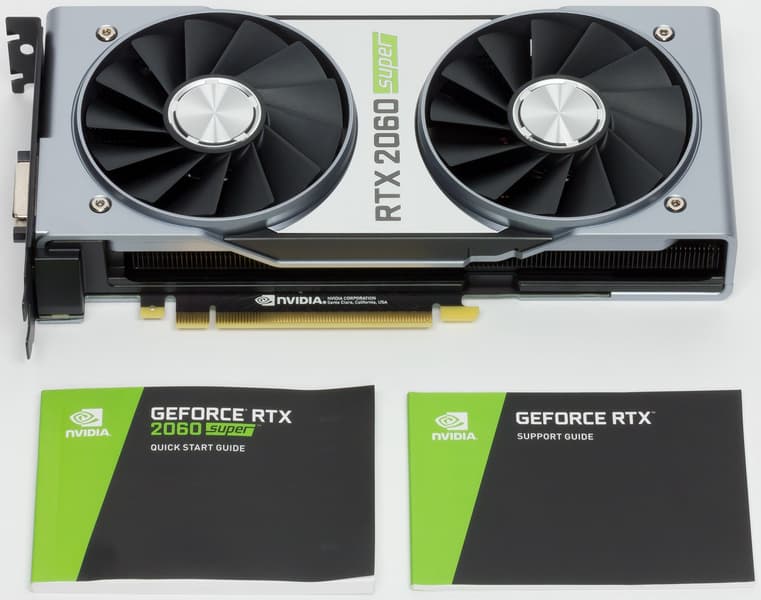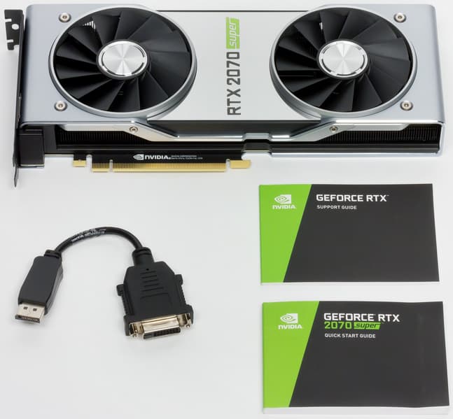 Базовый комплект поставки серийной карты должен включать в себя руководство пользователя, диск с драйверами и утилитами. Однако традиционно карты серии Founders Edition идут без носителей информации, ибо купить такие карты можно только через интернет-магазин, а значит, покупатель способен и сам скачать ПО с сайта производителя. Поскольку у RTX 2070 Super нет видеовыхода DVI, то в комплекте идет переходник с HDMI на DVI.