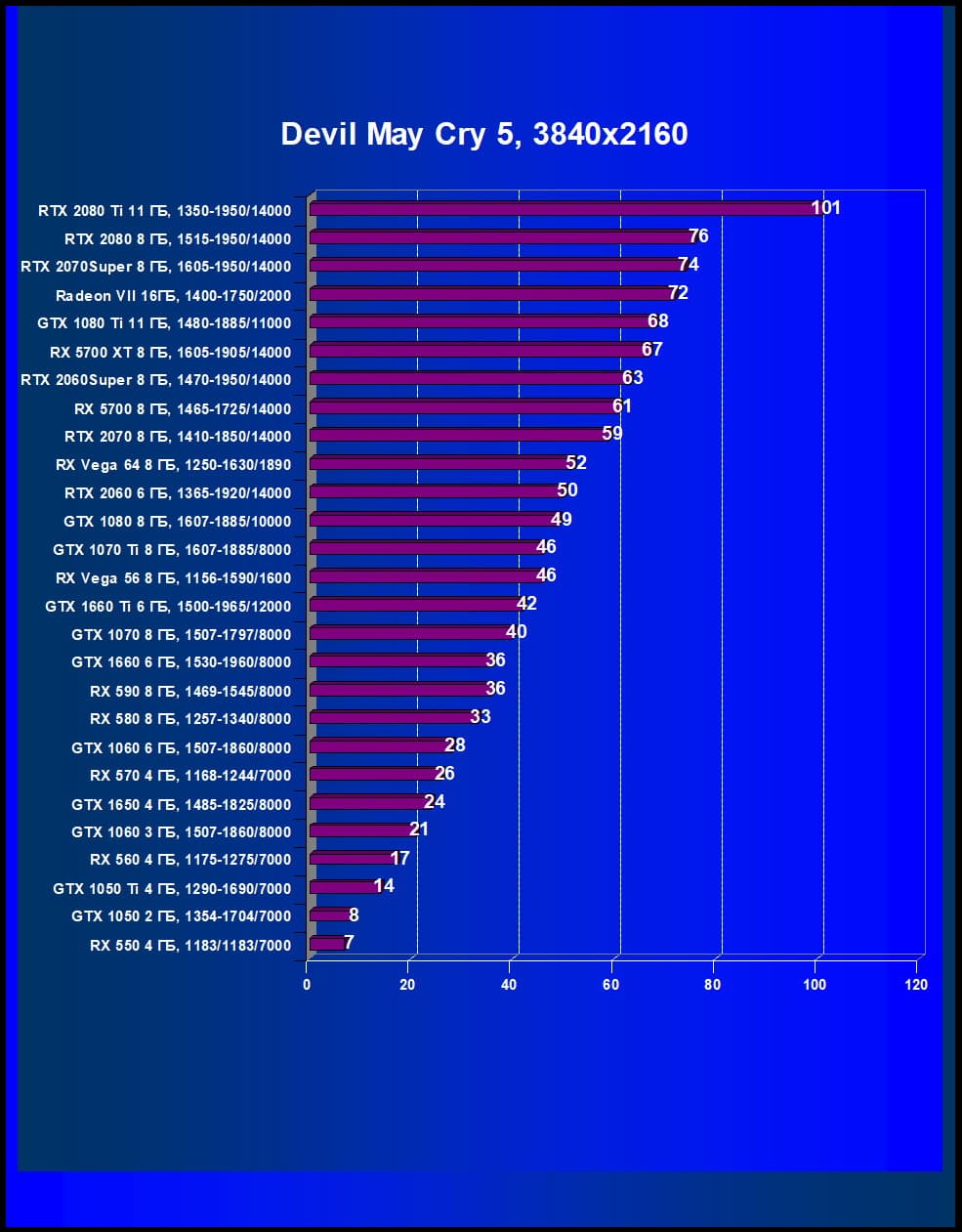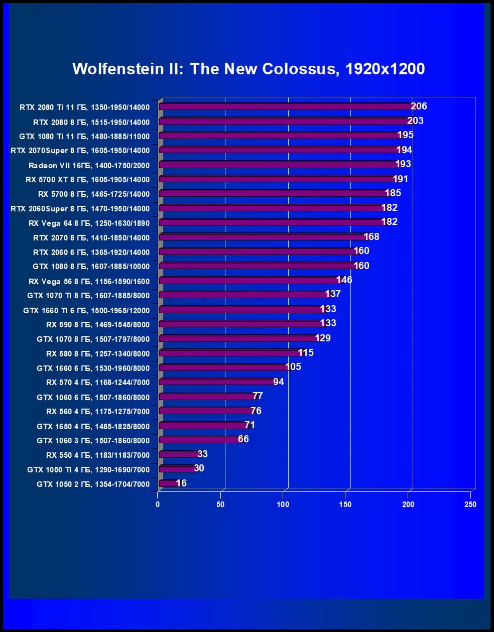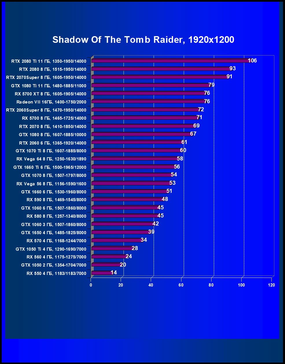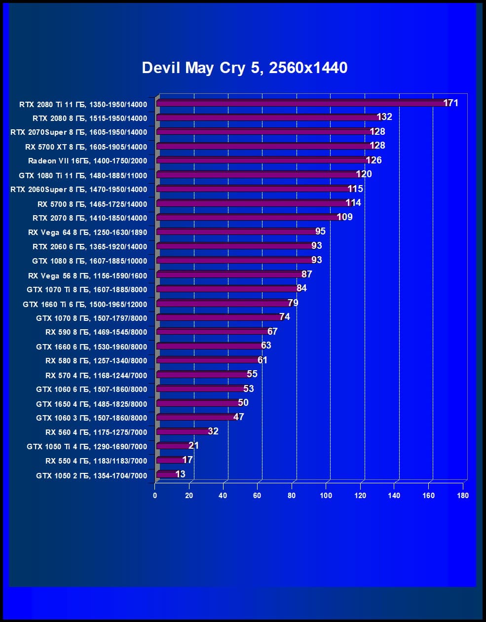 | 12 | RX 5700 XT 8 ГБ, 1605—1905/14000 | 253 | 860 | 34 000 |
