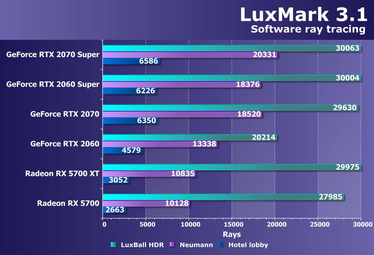 Выбрать соперников для анализа производительности новых видеокарт серии Super было очень просто. Так как модели Super заменяют на рынке обычные решения из этого же семейства GeForce RTX, то их мы и взяли — для того, чтобы понять, насколько улучшения в графических процессорах помогли увеличить производительность в представленных синтетических задачах.