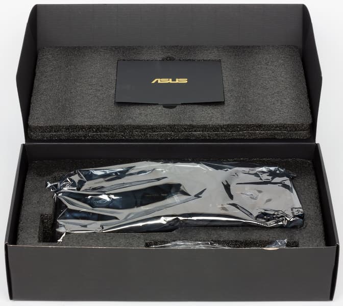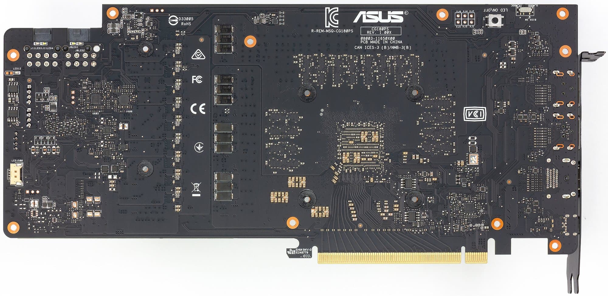 К микросхемам памяти прижимается тонкая рамка с термоинтерфейсом, не обеспечивающая серьезного рассеивания тепла. Силовые транзисторы через толстый слой термоинтерфейса охлаждаются вторым из двух радиаторов системы охлаждения GPU. На обороте видеокарты установлена толстая пластина, которая обеспечивает жесткость относительно массивной видеокарты (предотвращая изгиб печатной платы). СО оснащена подсветкой, цветом которой можно управлять с помощью вышеупомянутой утилиты Asus GPU Tweak II.