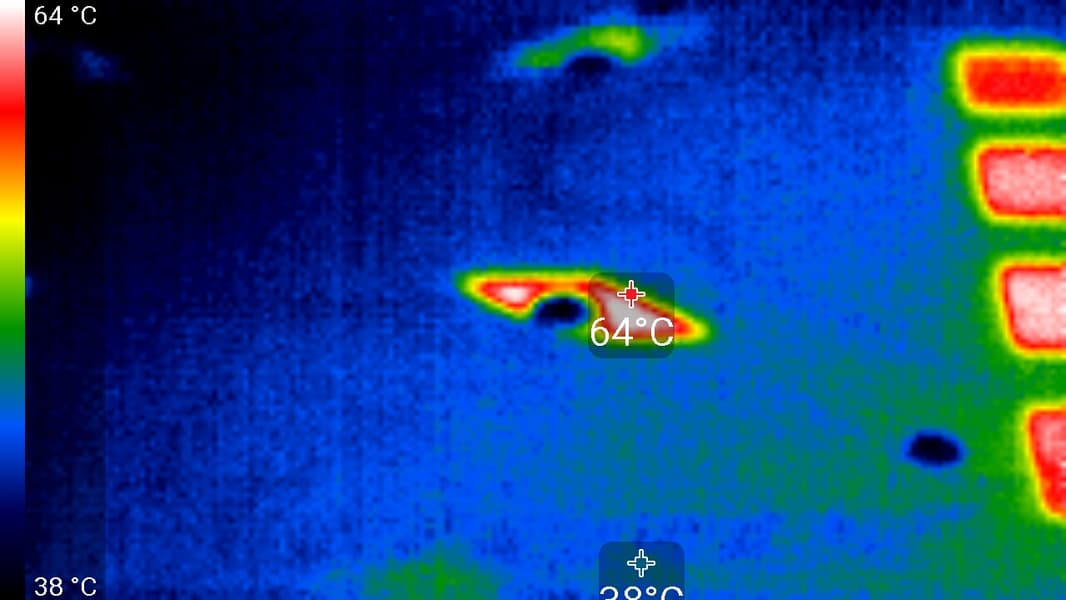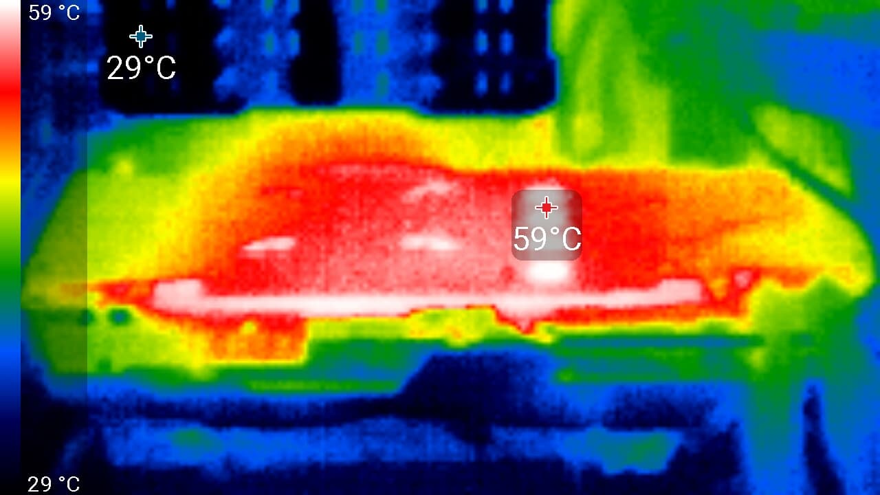Максимальный нагрев — центральная область с обратной стороны печатной платы.