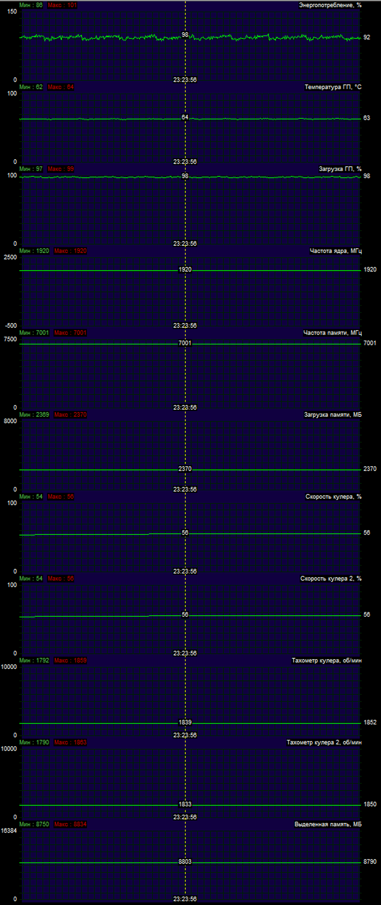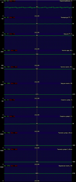 После 6-часового прогона под нагрузкой максимальная температура ядра не превысила 64 градусов, что является просто прекрасным результатом для видеокарты высокого уровня.