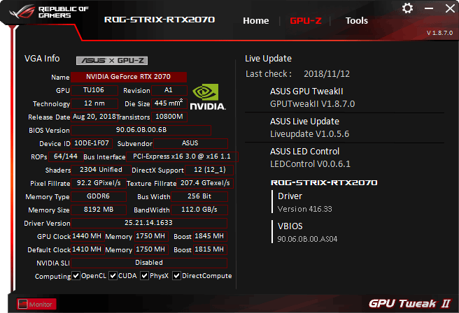 Что касается тактовых частот нового графического процессора в составе младшей модели линейки GeForce RTX, то турбо-частота GPU у референсного варианта (не путать с FE!) карты составляет 1620 МГц. Как и две другие модели линейки, предлагаемая компанией со своего сайта видеокарта RTX 2070 Founder’s Edition имеет фабричный разгон до 1710 МГц — на 90 МГц больше, чем у стандартных вариантов от производителей видеокарт.