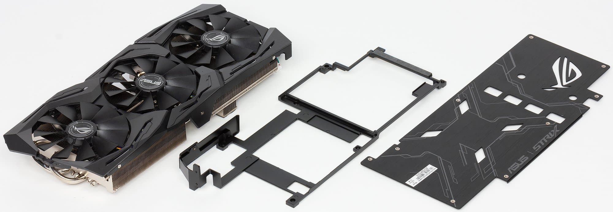 За охлаждение GPU отвечают два больших радиатора, соединенные тепловыми трубками с пластиной, прижимаемой к чипу. Разумеется, всё из медных сплавов и покрыто никелем. Поверх радиаторов установлен кожух с тремя вентиляторами Wing-blade (так их называет производитель). Декларируется пылезащищенность и минимальный шум такой системы. Как и во всей серии Strix, вентиляторы не включаются при нагреве GPU до 50-55 градусов. Так что если при включении ПК вентиляторы дернулись, а потом раздумали вращаться, то это нормально.