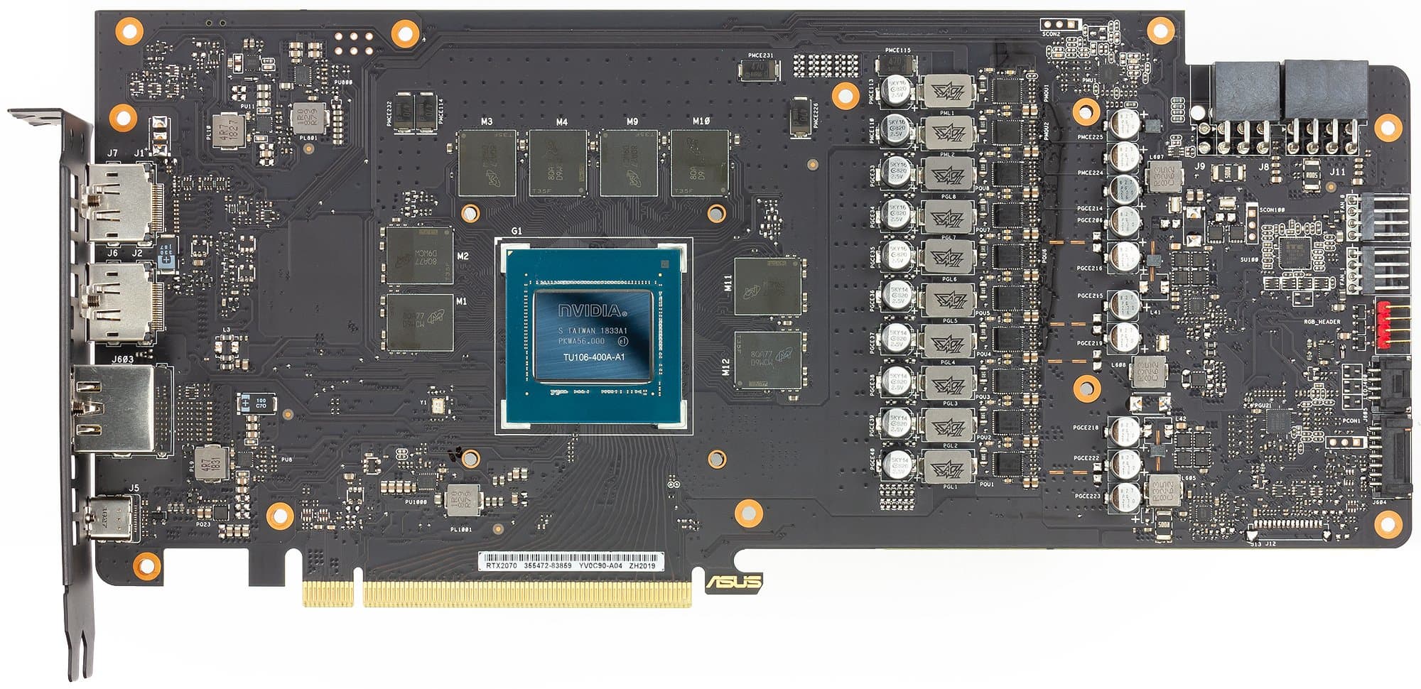 Младшая модель видеокарты GeForce RTX 2070 основана на графическом процессоре TU106. Этот GPU используется только для этой платы и имеет площадь 445 мм² (сравните с 545 мм² у TU104, на котором сделан RTX 2080, и с 471 мм² у лучшего игрового чипа семейства Pascal — GP102, основе GeForce GTX 1080 Ti), содержит 10,8 млрд транзисторов, по сравнению с 13,6 млрд транзисторов у среднего TU104 и с 12 млрд транзисторов у GP102 — основе GTX 1080 Ti.