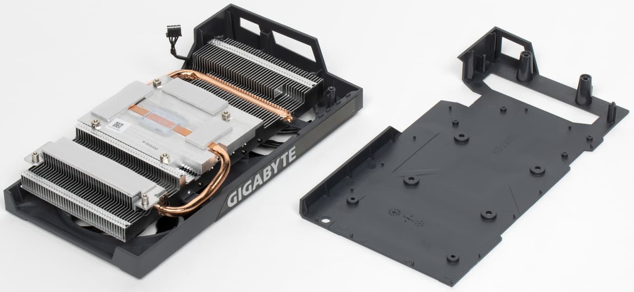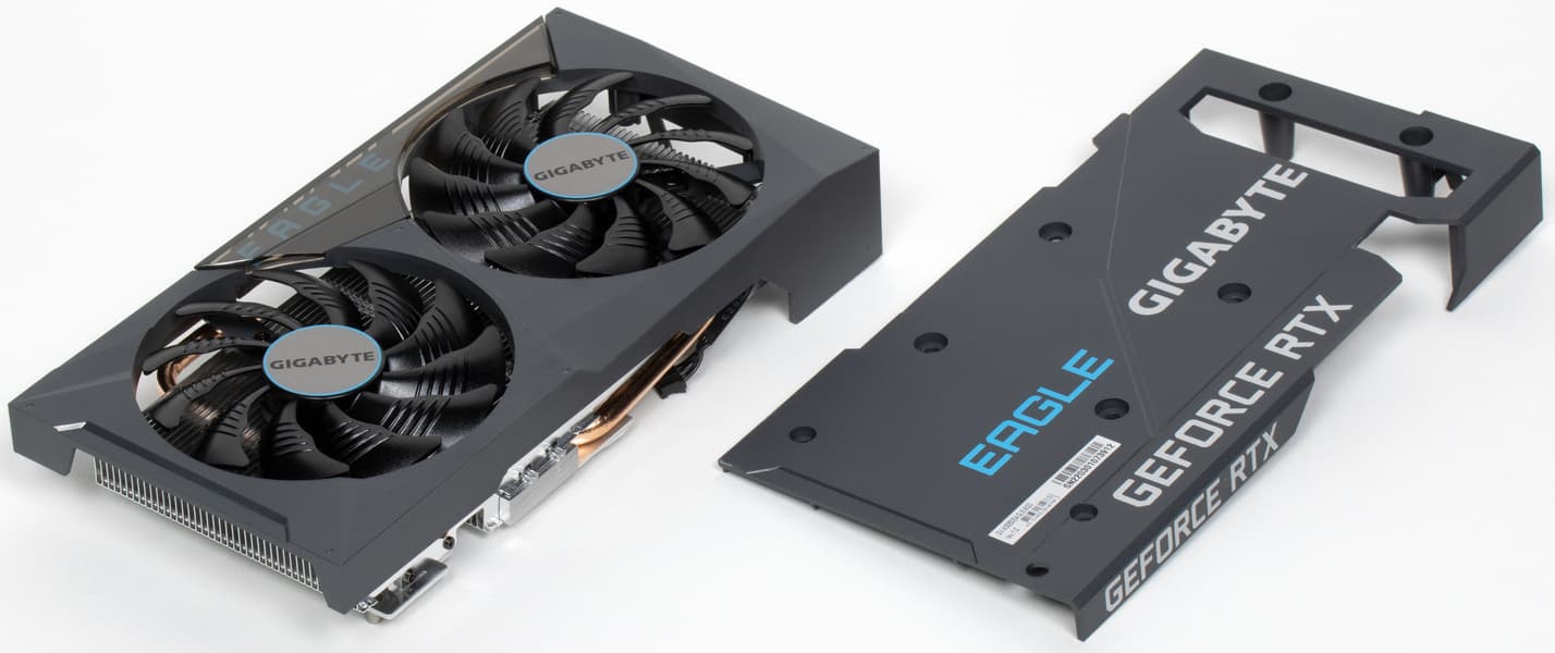 Что касается конкретной карты Gigabyte GeForce RTX 3050 Eagle 8 ГБ, то она достаточно компактная, занимает два слота в корпусе, но шум у нее откровенно высоковат при не слишком впечатляющем охлаждении (какой контраст с Gigabyte Radeon RX 6500 XT Gaming OC 4 ГБ!). У карты нет подсветки, что порадует определенную категорию потенциальных покупателей. Еще из плюсов можно перечислить наличие защитной пластины на тыльной стороне изделия, которая обеспечивают необходимую прочность, предотвращая изгиб и деформацию печатной платы. А также стабильную работу видеокарт GeForce RTX 3050 серии Eagle от Gigabyte обеспечивают многофазные модули питания ключевых компонентов, а также высоконадежные дроссели и конденсаторы.