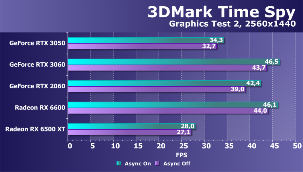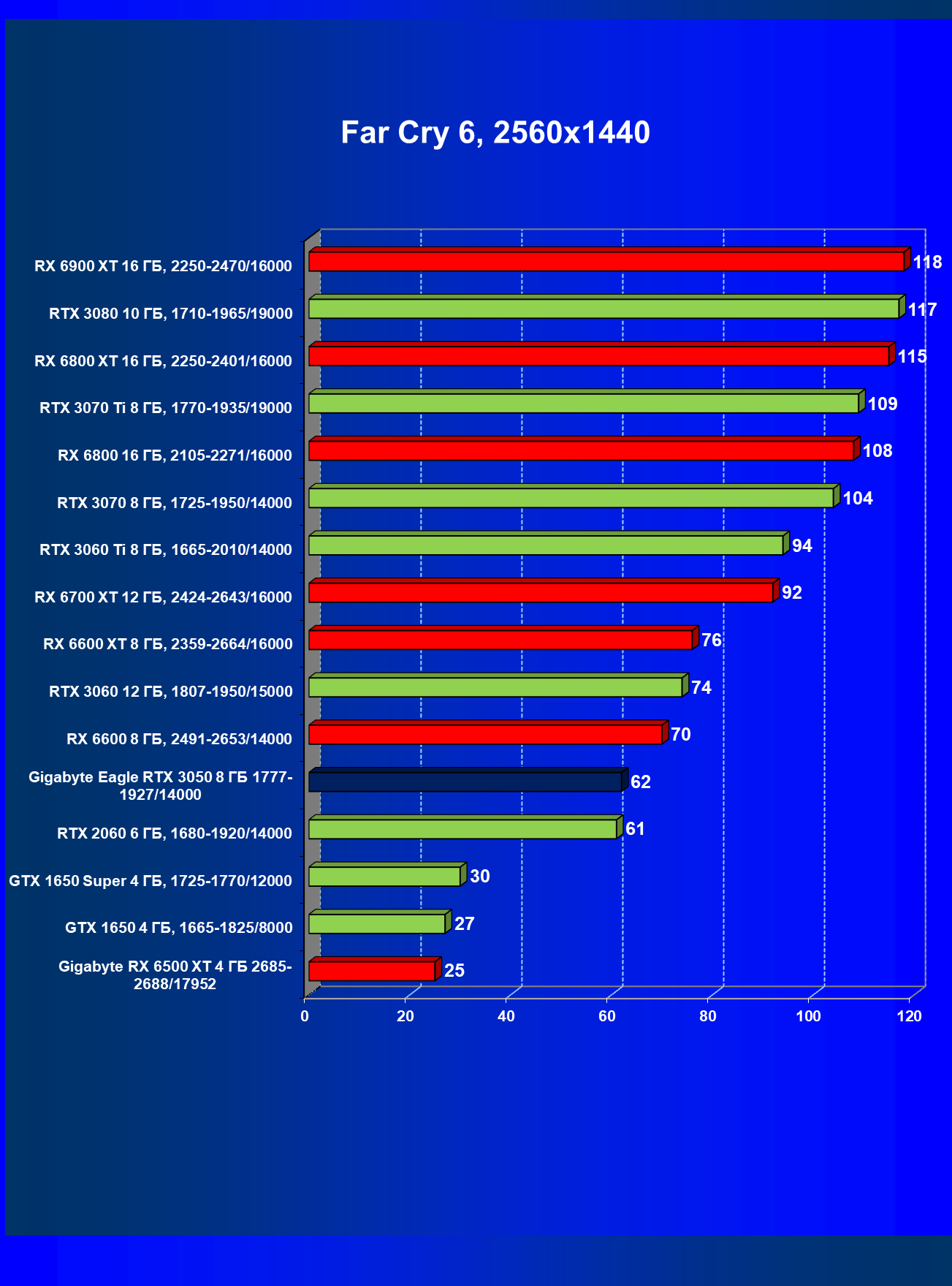 Рейтинг фиксирует, что GeForce RTX 3050 по производительности соответствует GeForce RTX 2060, а из видеокарт конкурента Radeon RX 6600 быстрее, а Radeon RX 6500 XT значительно медленнее.