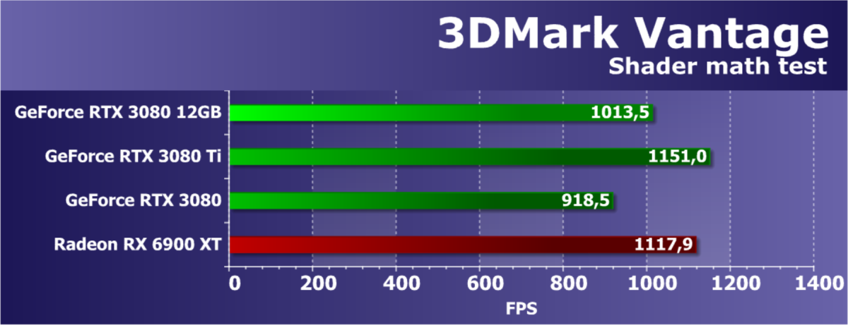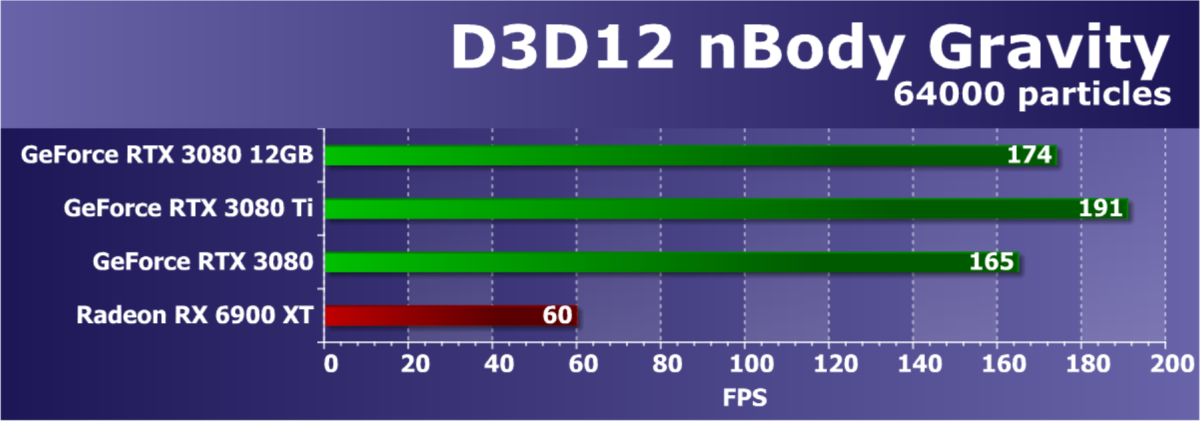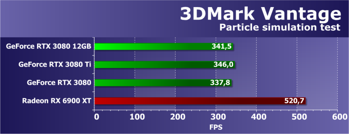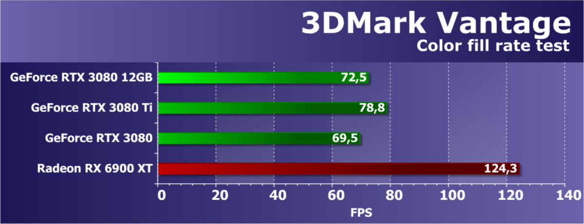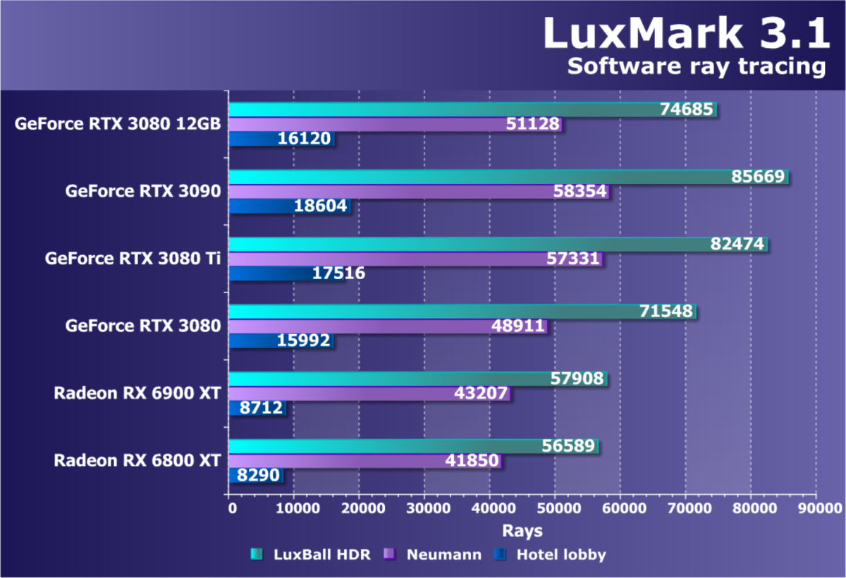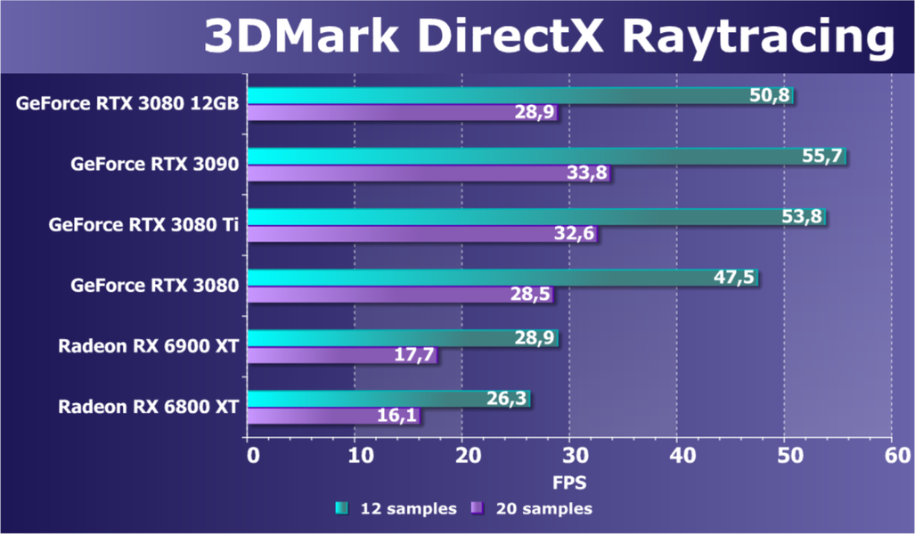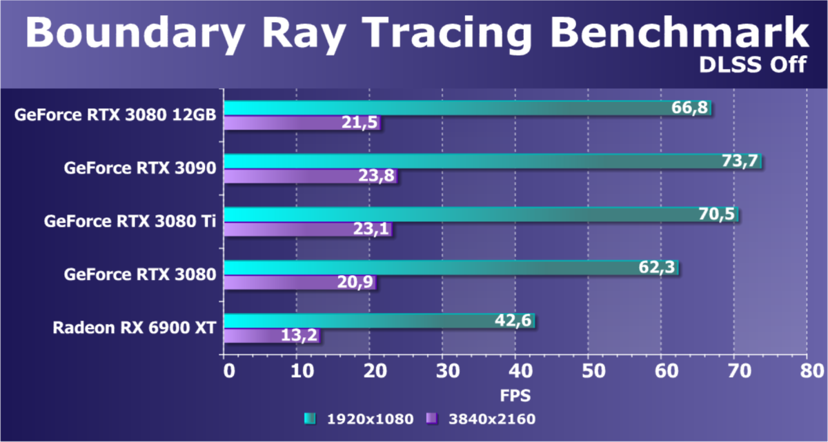 Что касается конкурентов, то прямым соперником новинки можно назвать видеокарты моделей Radeon RX 6800 XT и RX 6900 XT, имеющие близкую к разным вариантам RTX 3080 12 ГБ цену. В теории решение Nvidia дает больше вычислительной производительности и ПСП, но зато у Radeon еще больший объем видеопамяти с большим кэшем Infinity Cache в 128 МБ, что нивелирует разницу между ПСП для разных типов памяти: GDDR6 и GDDR6X. Но еще важнее преимущество по скорости аппаратной трассировки лучей у GeForce, ведь при включении эффектов, использующих трассировку, производительность Radeon падает куда сильнее. Также у Nvidia есть явное преимущество и в виде поддержки технологии увеличения производительности DLSS, использующей тензорные ядра.