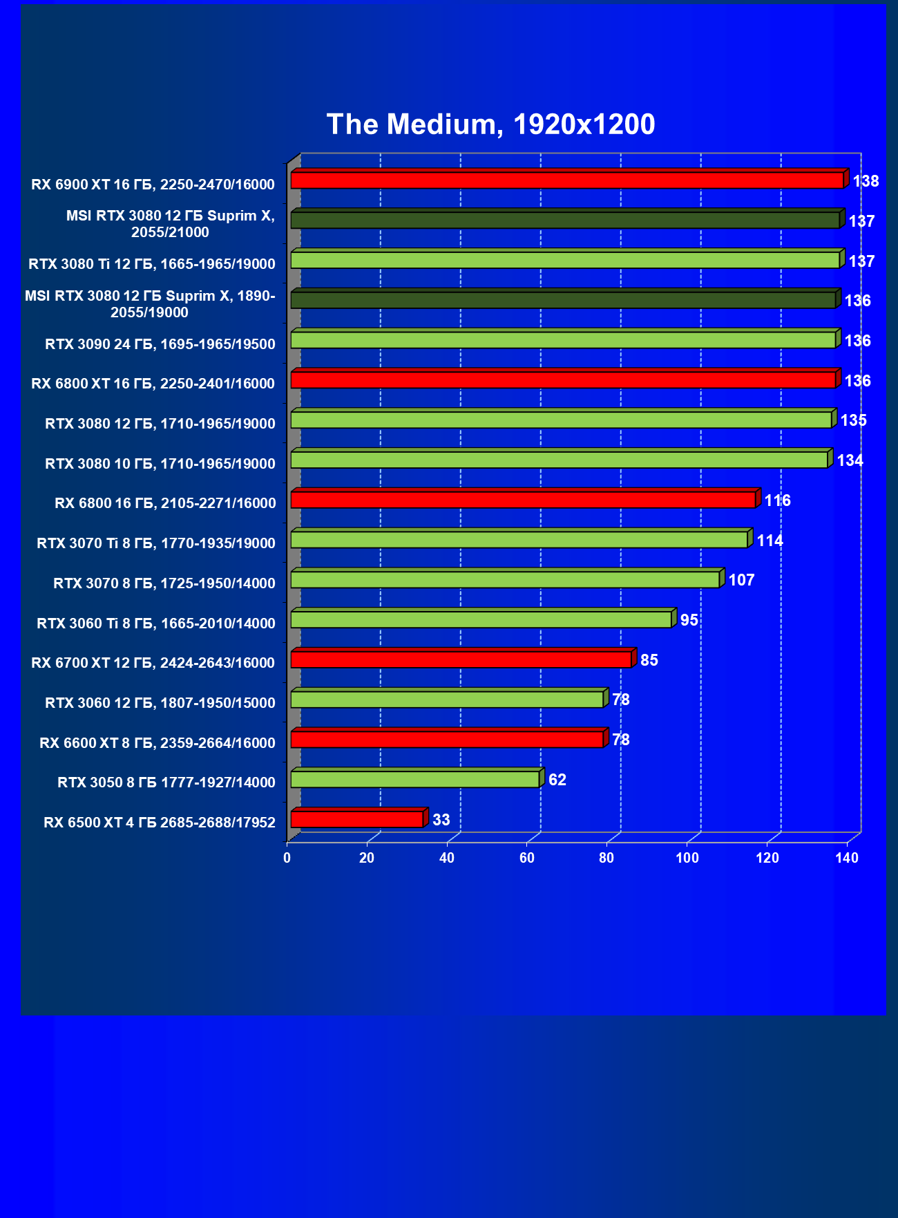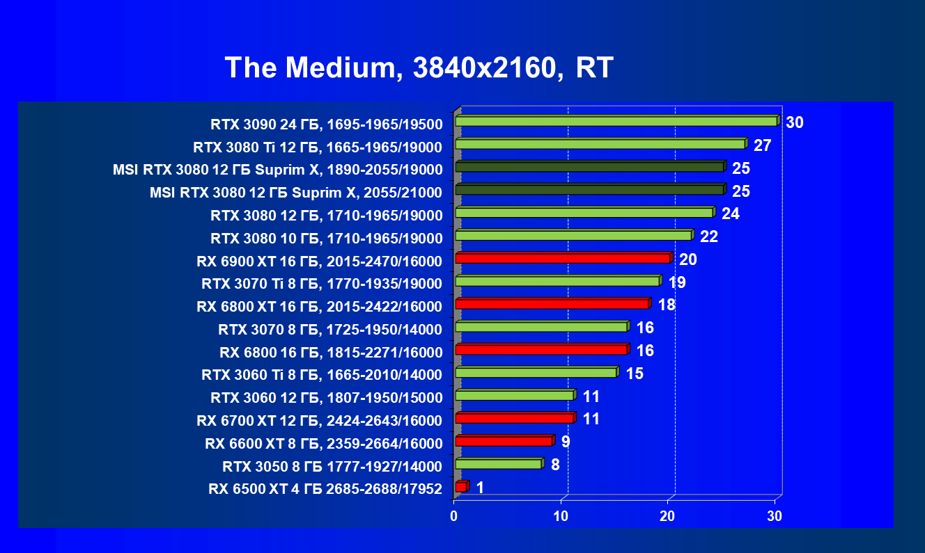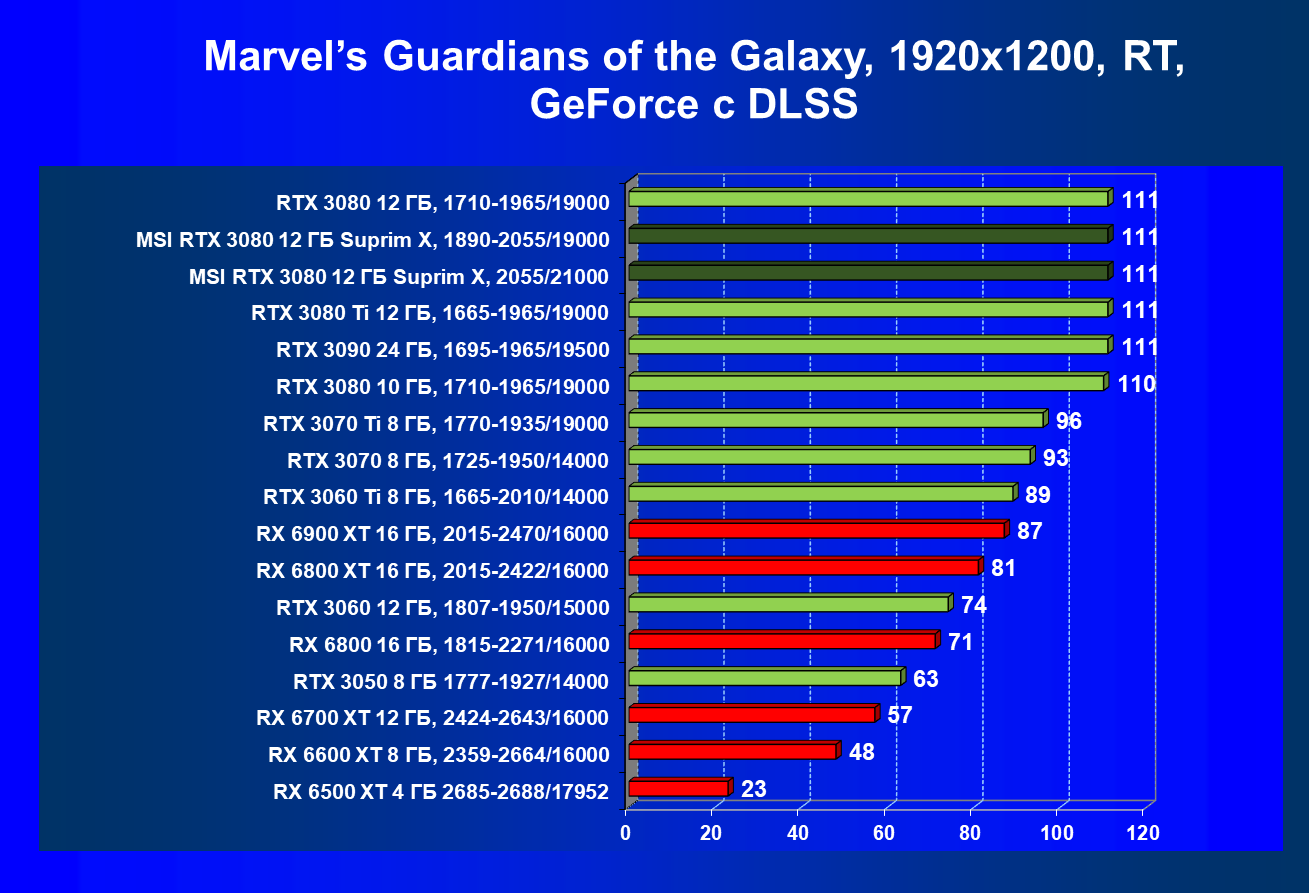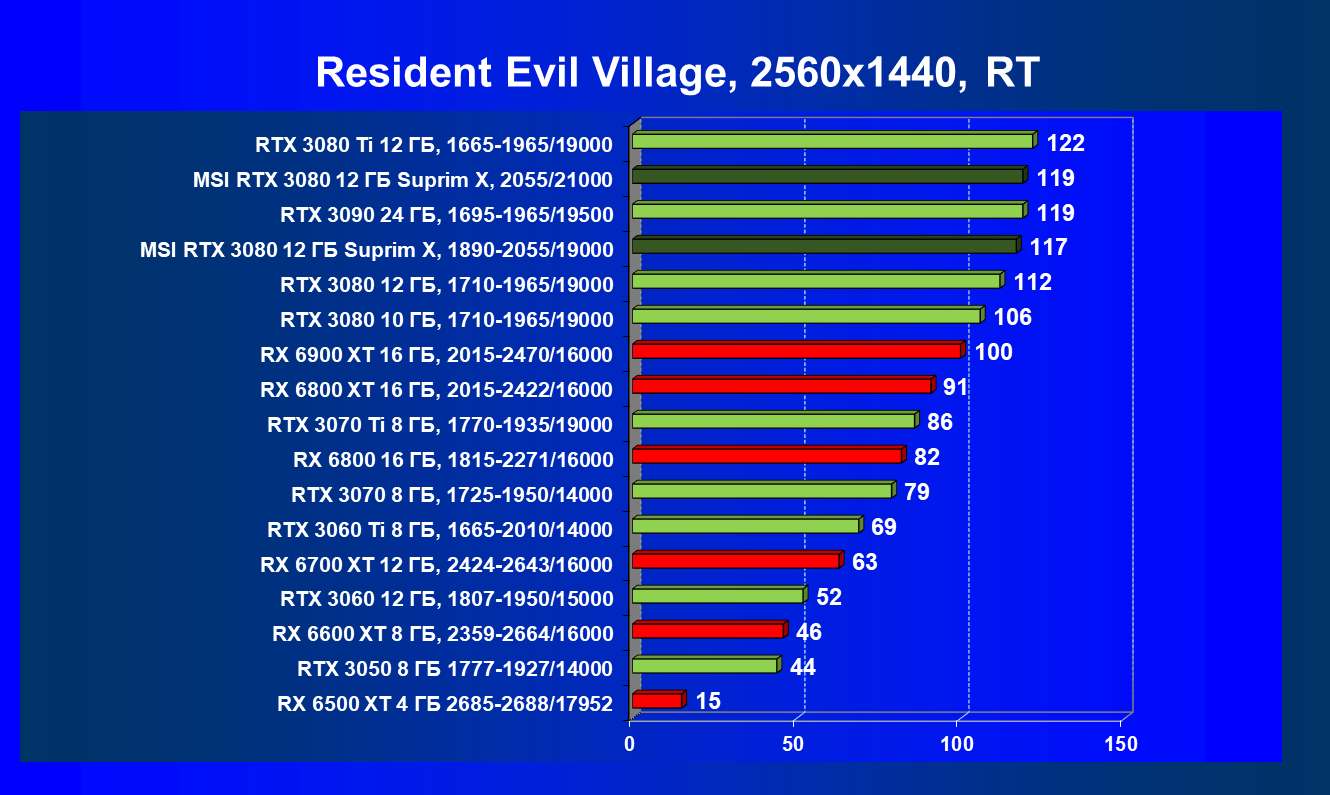 В группу с RTX 3080 попал и Radeon RX 6900 XT, который формально является конкурентом RTX 3090 и RTX 3080 Ti, но его стоимость на сегодня уже на уровне RTX 3080 и даже ниже. Поэтому неудивительно, что RX 6900 ХТ и возглавил данный рейтинг по классическим играм без трассировки лучей и DLSS/FSR. Как можно заметить, в таких играх даже RX 6800 XT опережает своего конкурента в лице RTX 3080, и только новая версия RTX 3080 с 12 ГБ видеопамяти из-за чуть более производительного GPU и увеличенной шины обмена с памятью сумела догнать Radeon RX 6800 XT. А вот карта MSI из-за повышенных частот работы графического процессора обошла конкурента в лице RX 6800 XT и заняла место примерно посредине между ним и RTX 3080 Ti. Разгон карты MSI, хоть и был незначительным, позволил ей существенно приблизиться к RTX 3080 Ti.