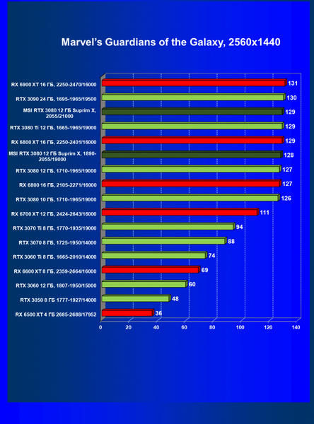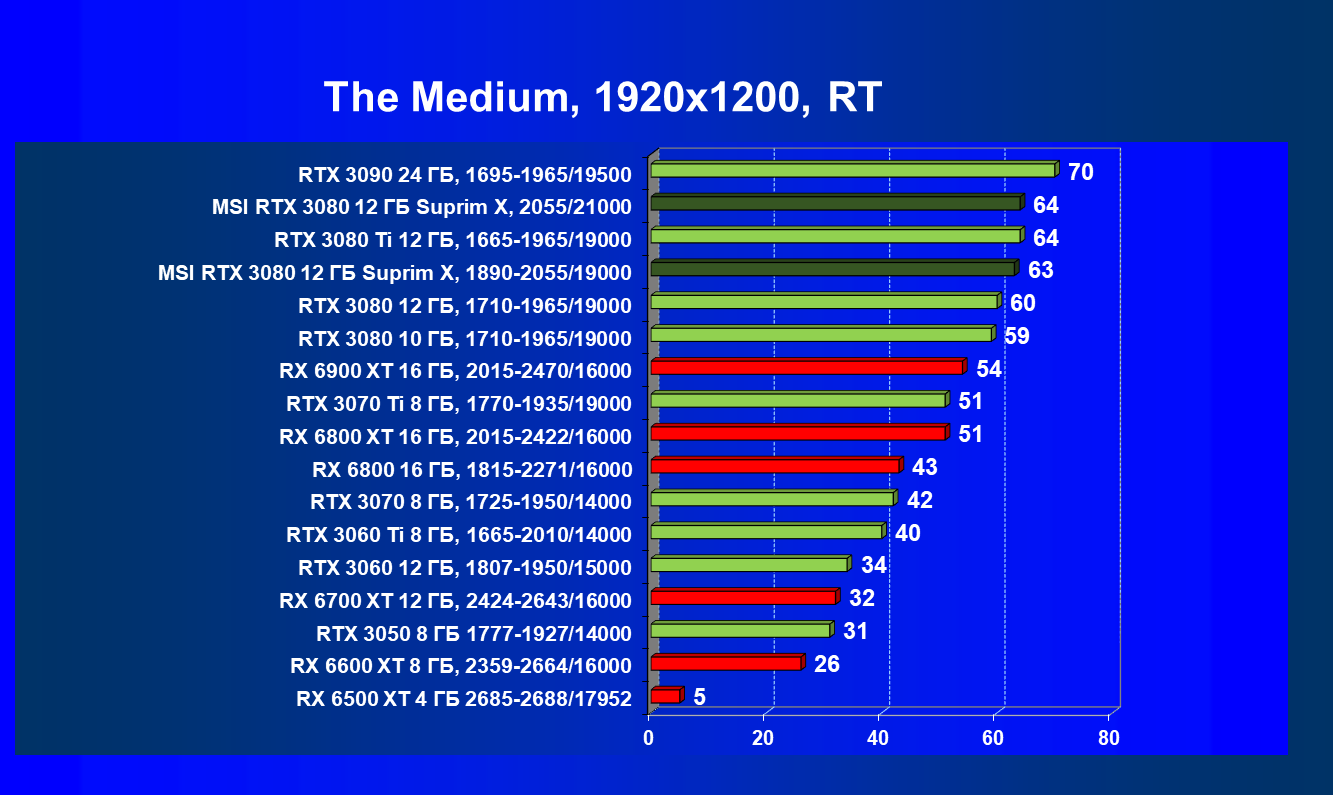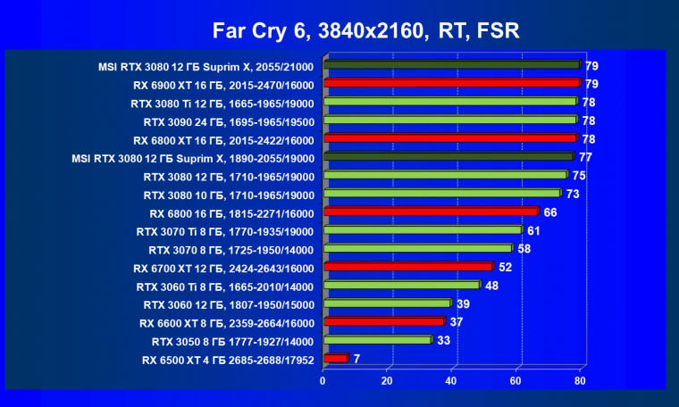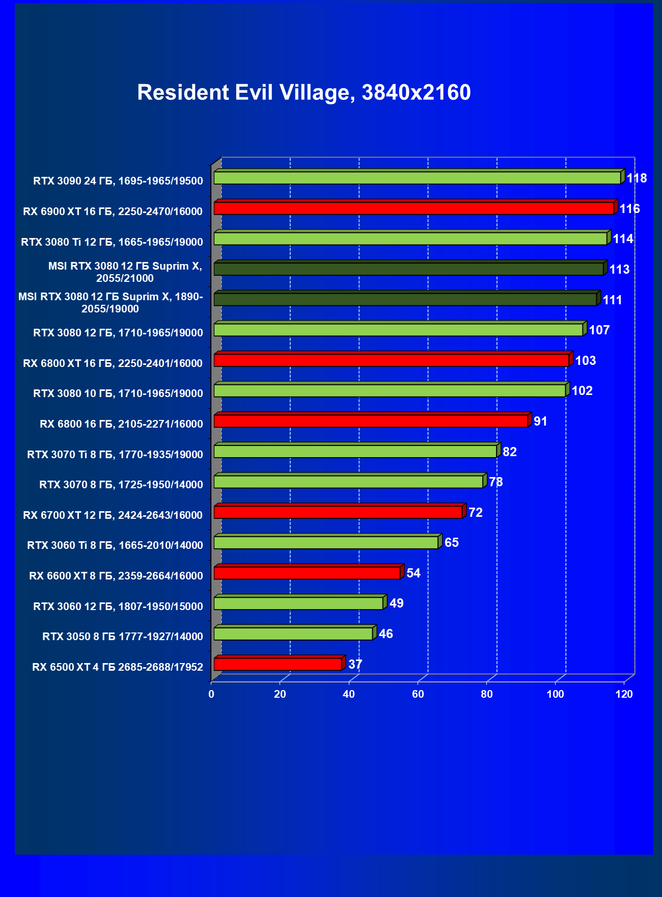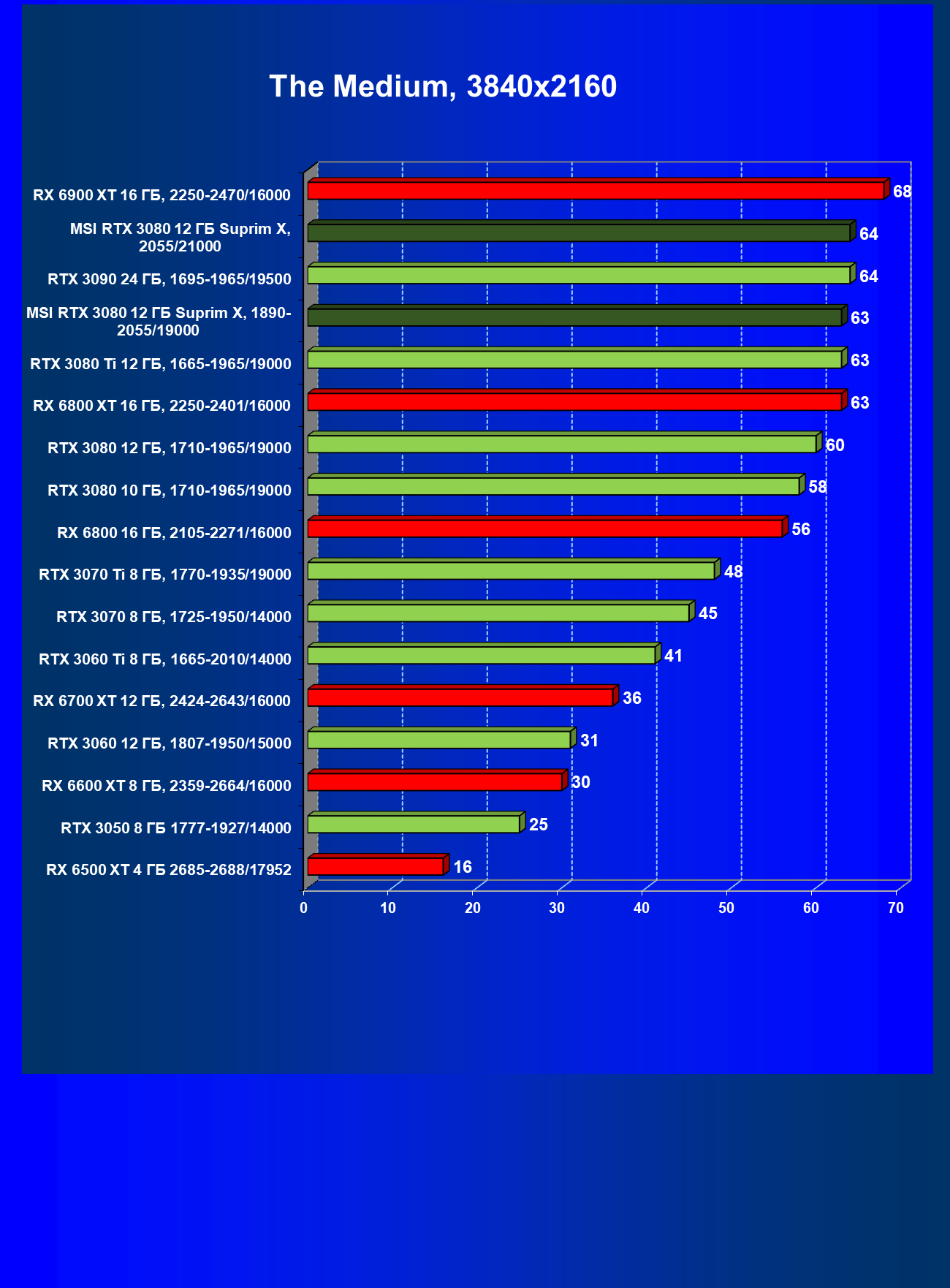 В группу с RTX 3080 попал и Radeon RX 6900 XT, который формально является конкурентом RTX 3090 и RTX 3080 Ti, но его стоимость на сегодня уже на уровне RTX 3080 и даже ниже. Поэтому неудивительно, что RX 6900 ХТ и возглавил данный рейтинг по классическим играм без трассировки лучей и DLSS/FSR. Как можно заметить, в таких играх даже RX 6800 XT опережает своего конкурента в лице RTX 3080, и только новая версия RTX 3080 с 12 ГБ видеопамяти из-за чуть более производительного GPU и увеличенной шины обмена с памятью сумела догнать Radeon RX 6800 XT. А вот карта MSI из-за повышенных частот работы графического процессора обошла конкурента в лице RX 6800 XT и заняла место примерно посредине между ним и RTX 3080 Ti. Разгон карты MSI, хоть и был незначительным, позволил ей существенно приблизиться к RTX 3080 Ti.