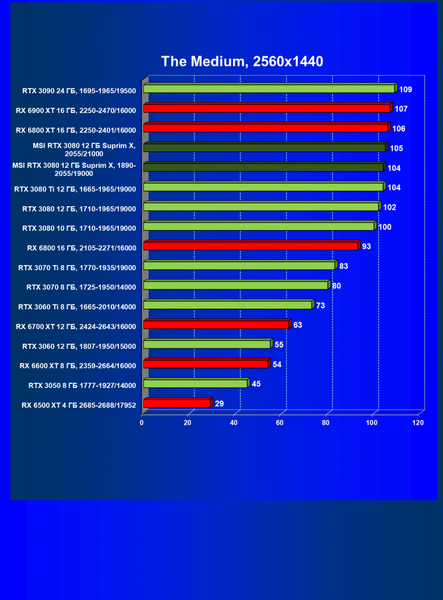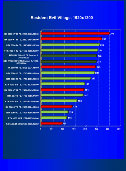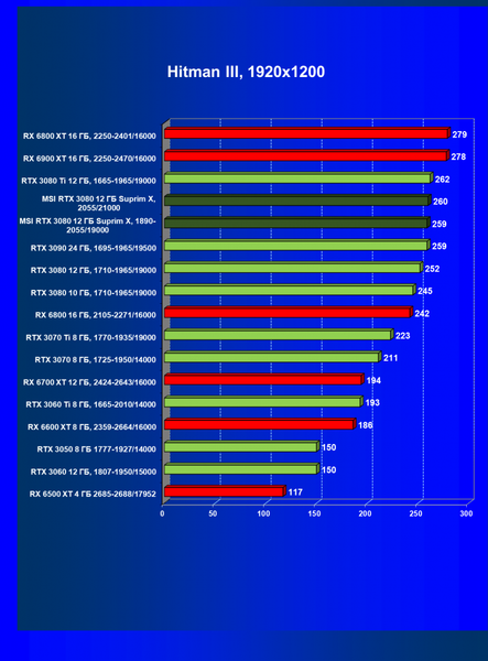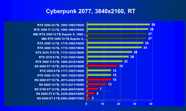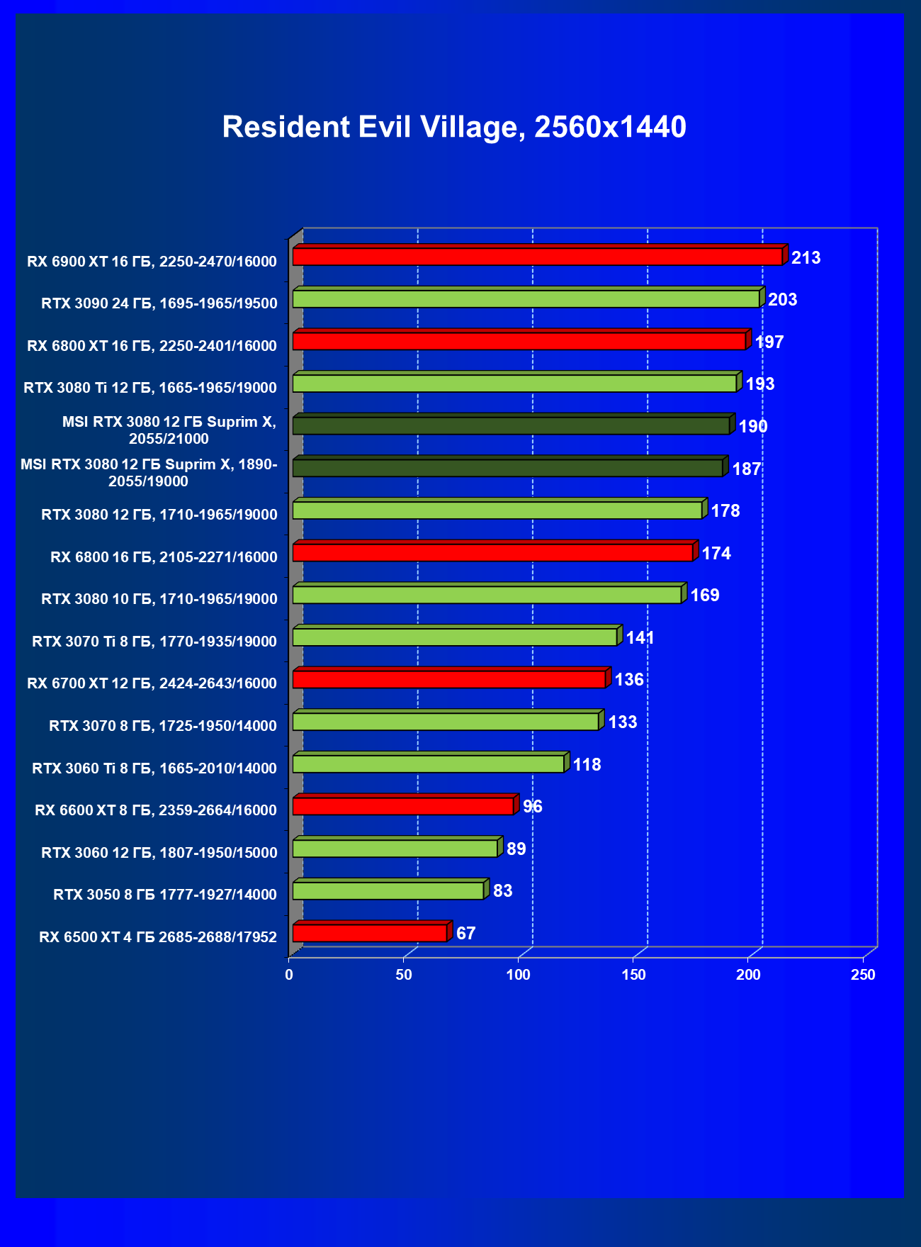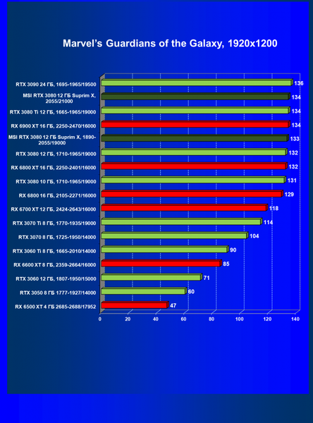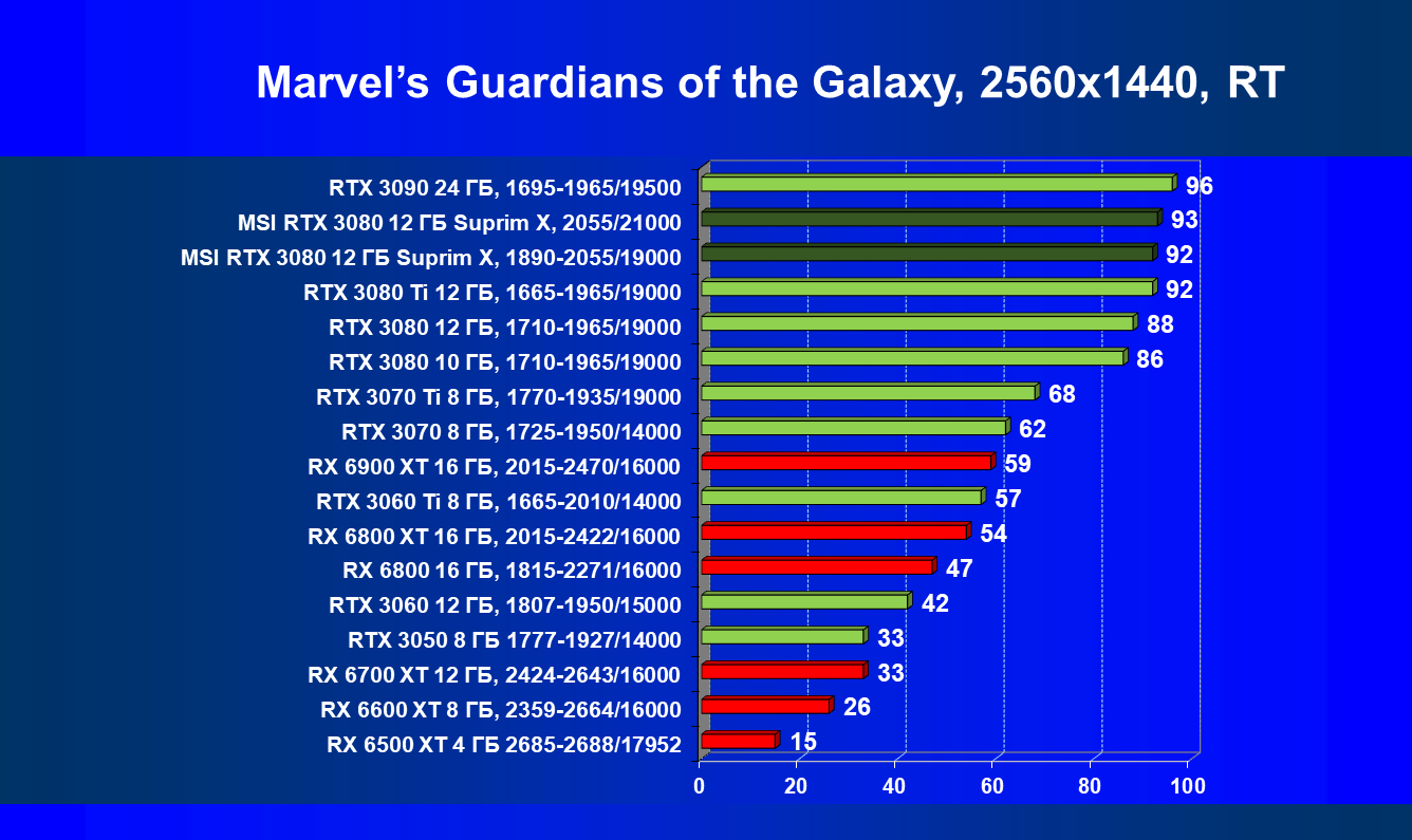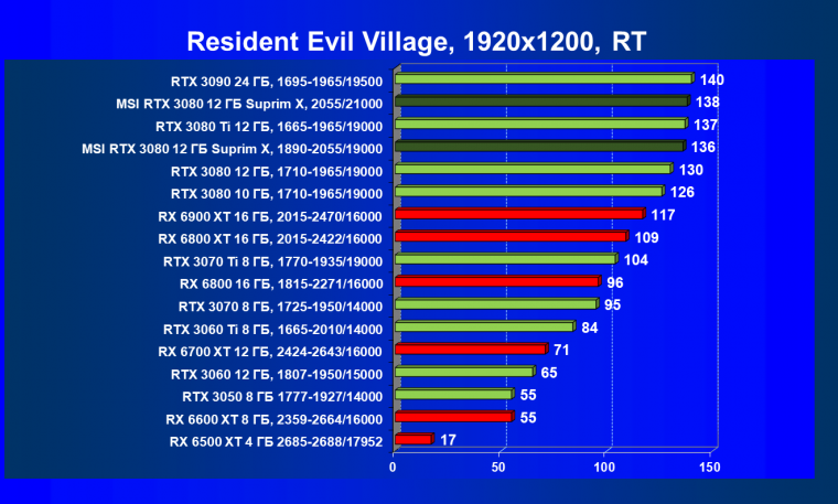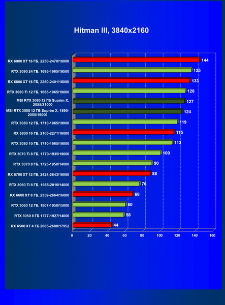 В группу с RTX 3080 попал и Radeon RX 6900 XT, который формально является конкурентом RTX 3090 и RTX 3080 Ti, но его стоимость на сегодня уже на уровне RTX 3080 и даже ниже. Поэтому неудивительно, что RX 6900 ХТ и возглавил данный рейтинг по классическим играм без трассировки лучей и DLSS/FSR. Как можно заметить, в таких играх даже RX 6800 XT опережает своего конкурента в лице RTX 3080, и только новая версия RTX 3080 с 12 ГБ видеопамяти из-за чуть более производительного GPU и увеличенной шины обмена с памятью сумела догнать Radeon RX 6800 XT. А вот карта MSI из-за повышенных частот работы графического процессора обошла конкурента в лице RX 6800 XT и заняла место примерно посредине между ним и RTX 3080 Ti. Разгон карты MSI, хоть и был незначительным, позволил ей существенно приблизиться к RTX 3080 Ti.
