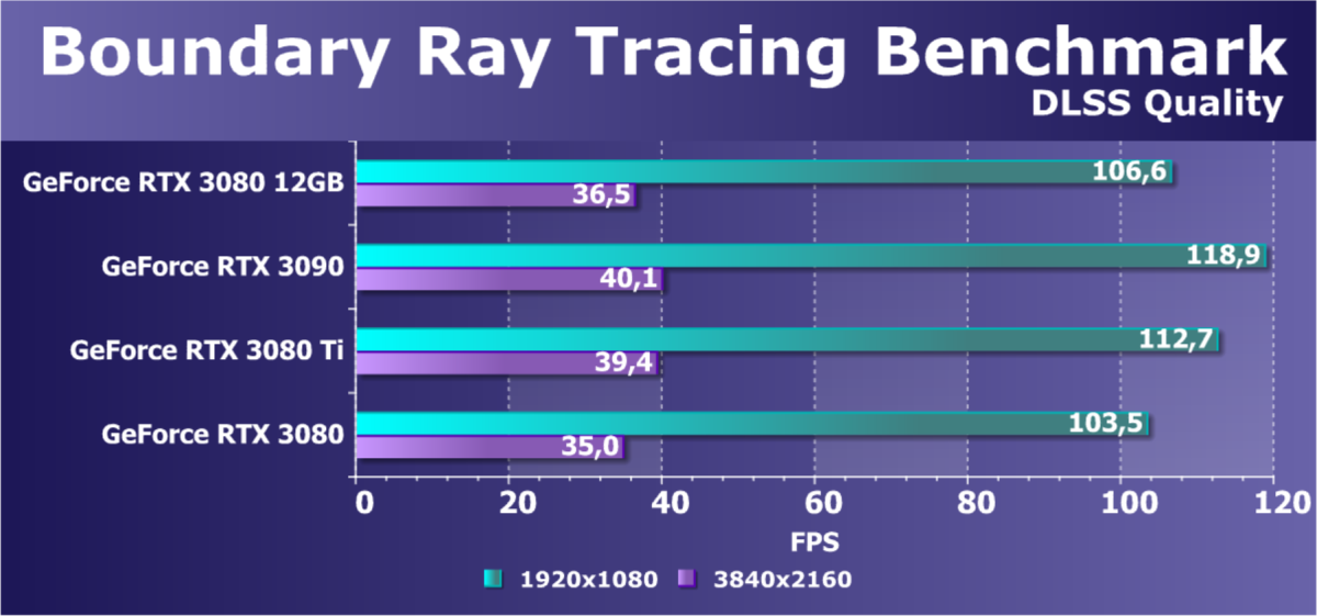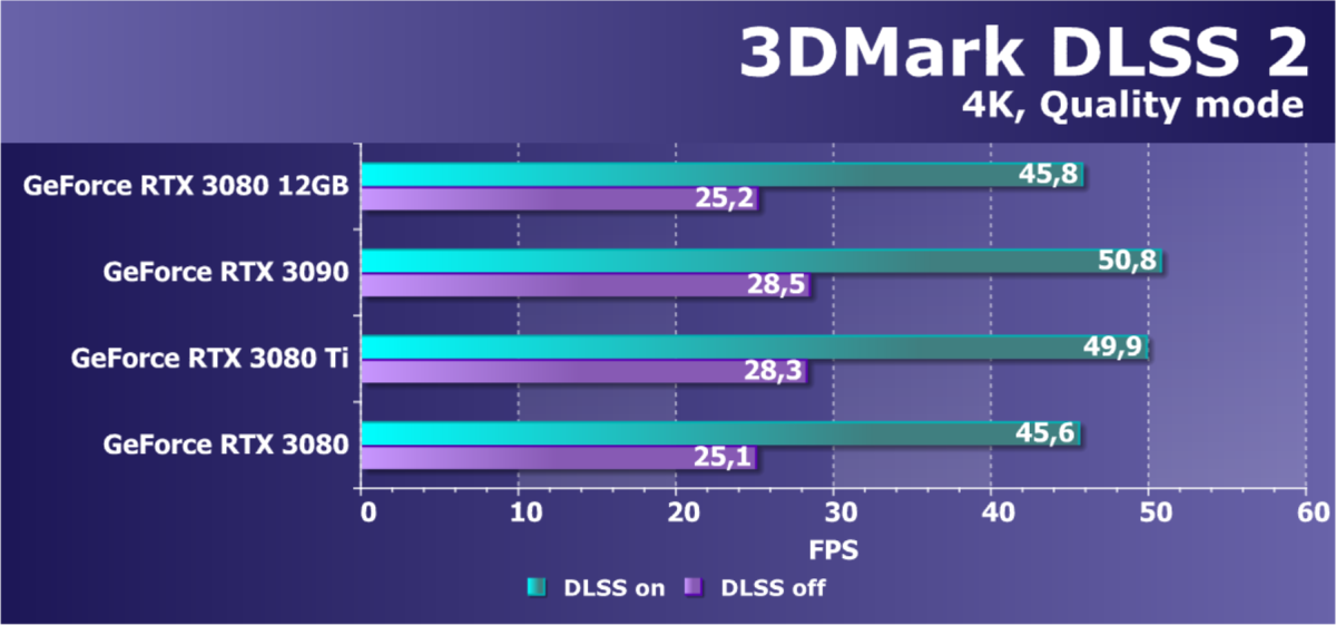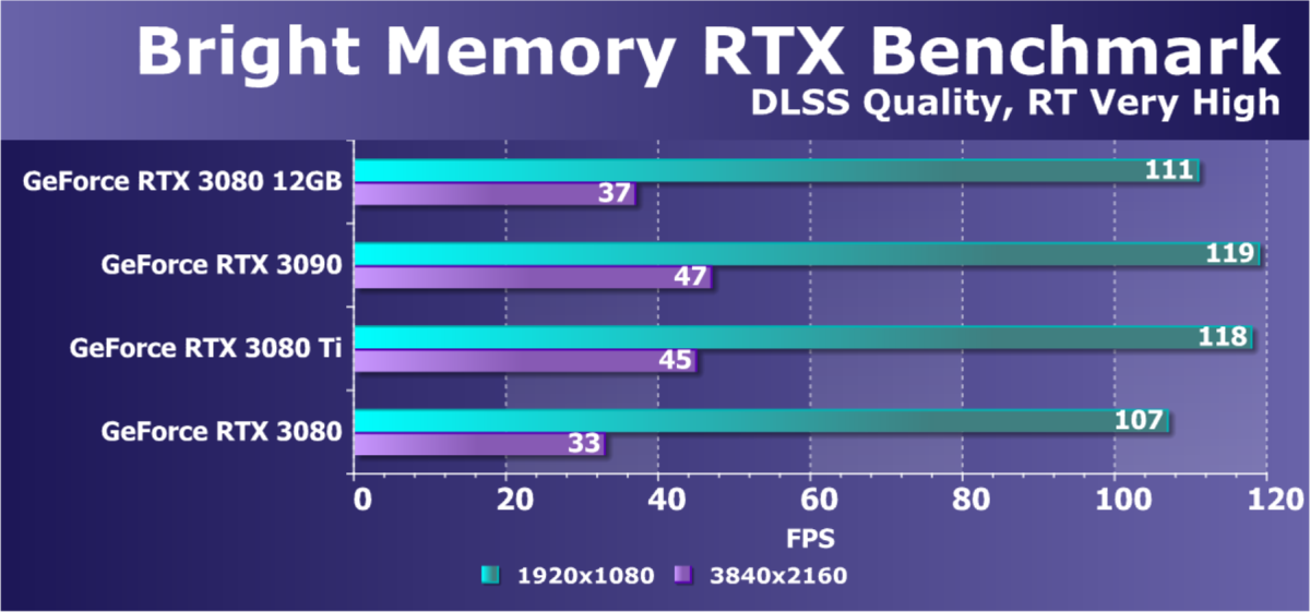 Учитывая, что RTX 3080 12 ГБ по производительности находится не так уж далеко от RTX 3090, а этот ускоритель мы уже исследовали в работе в разрешении 8К, то логично было протестировать в этом огромном разрешении и новинку — разумеется, с применением DLSS и трассировки лучей.