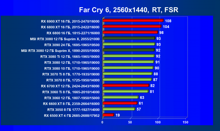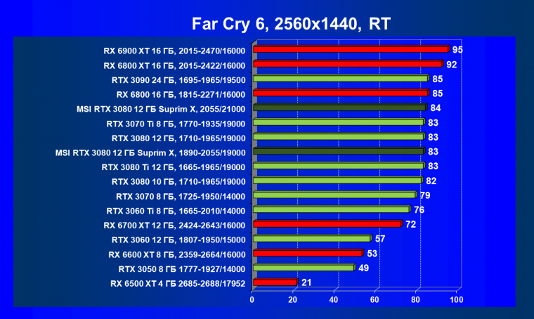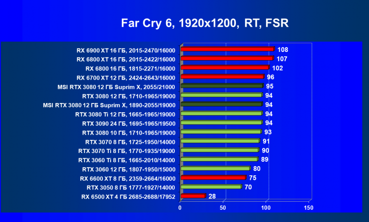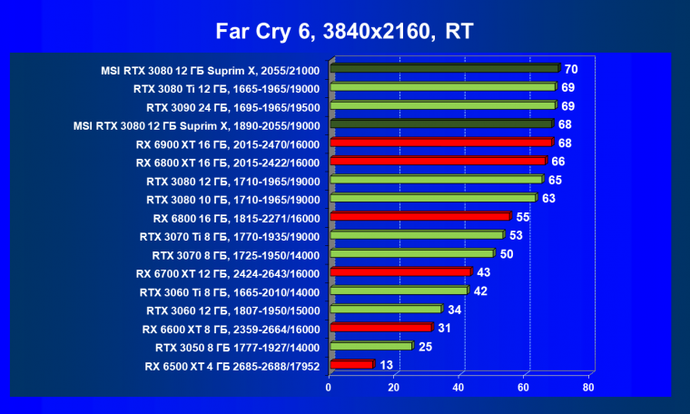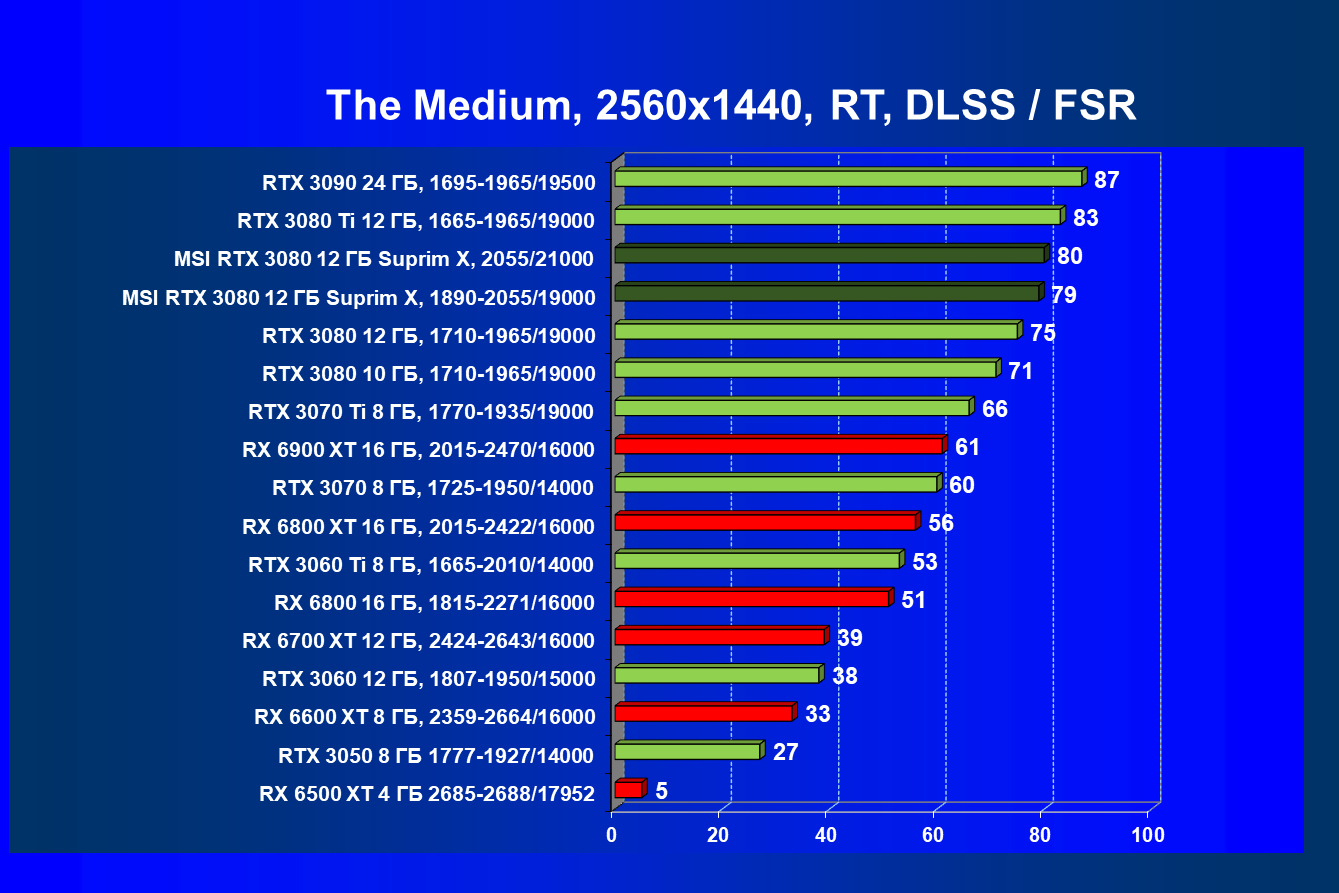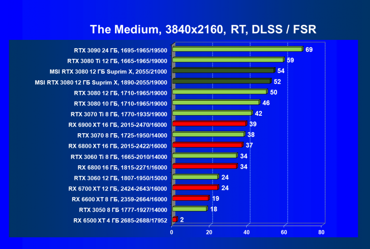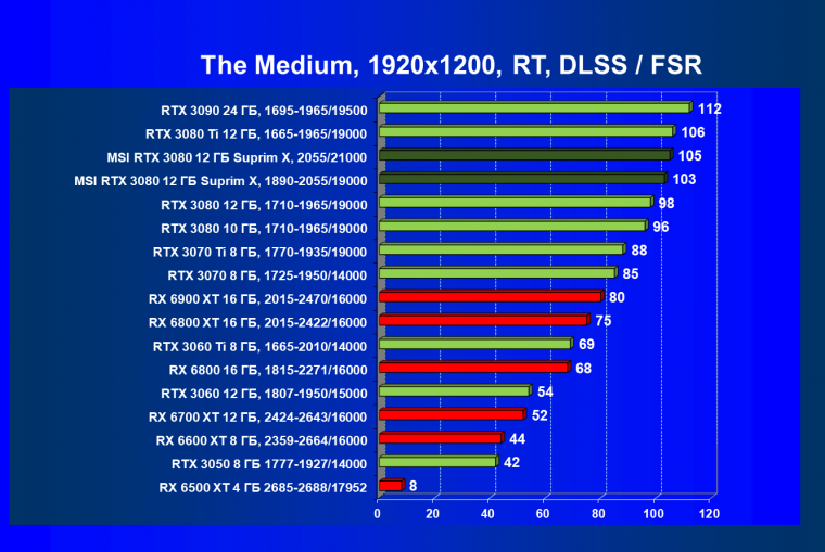 В играх с трассировкой лучей и DLSS/FSR ситуация для видеокарт AMD совсем иная, обе модели оказались аутсайдерами, и отрыв от RTX 3080 очень велик. Что касается видеокарт Nvidia, то новинка RTX 3080 12 ГБ лишь чуть-чуть превзошла по производительности версию с 10 ГБ. Карта MSI приблизилась к RTX 3080 Ti, но даже разгон не позволил ей догнать последнюю.